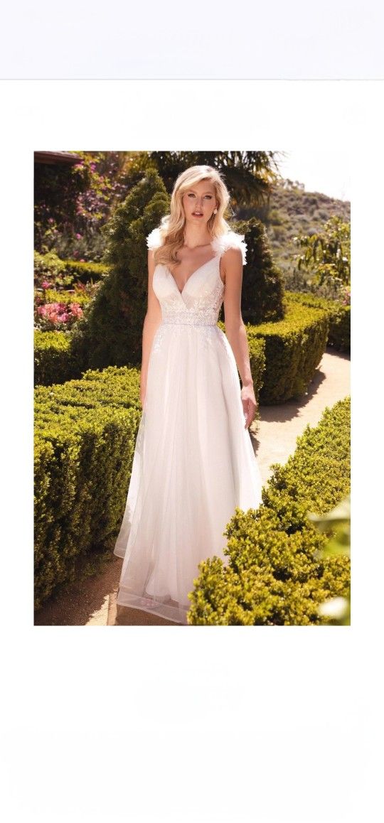 Dreamy Off white- Ivory V-neck Bridal Gown Size 14 The dress is sheer, sleeveless, and has a deep V neckline with ruching accents on the bust and fringe details on the shoulder strap. The fitted bodice is embellished with alluring floral appliques and features a low V-back with zipper closure. The A line tulle skirt gracefully flares into a horsehair hemline finish. This wedding dress reimagines the classic fit and flare gown for the modern bride. Measurements: Bust 40" , waist 32" , hips 43"
