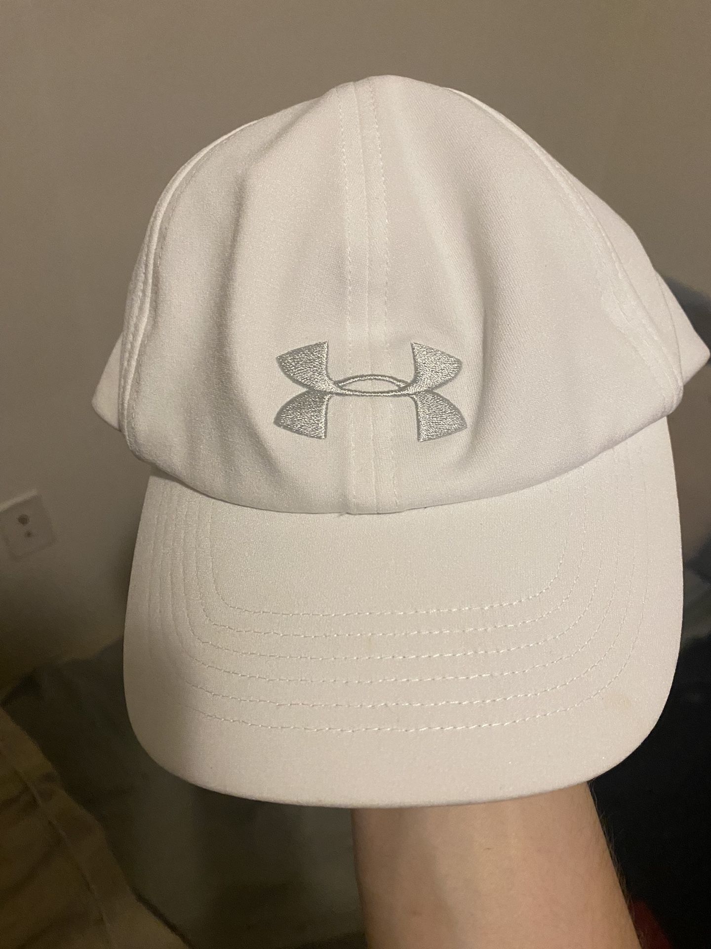 White womens Under Armour hat in good condition with a stain on the right side of the hat as seen in the pictures.