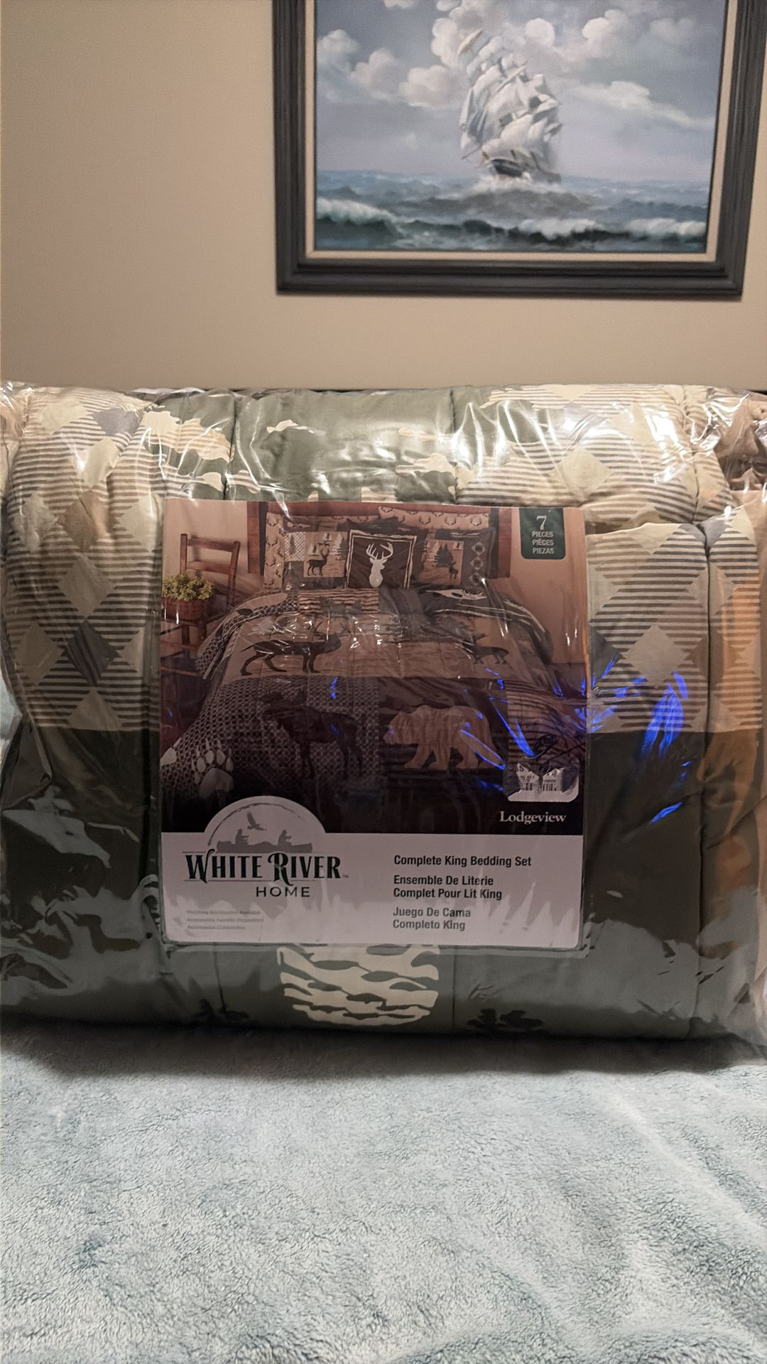 New Lodgeview 7 Piece King Bedding Set. Green, brown, tan, and burgundy colors. Moose, Bear, Buck, fish, and trees. Complete Set, never opened. Sells New for $200 + tax