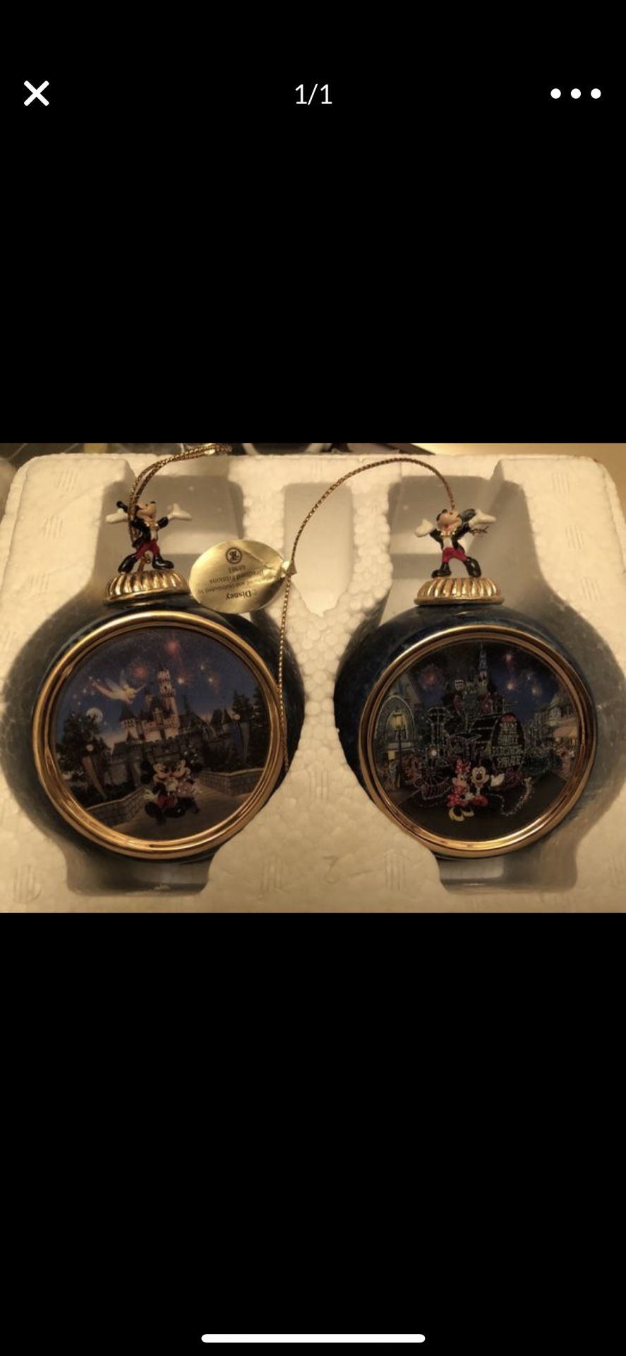 Mickey Mouse and Minnie mouse vintage BRadford exchange Mickey and sleeping beauty castle Christmas ornaments new in original styrofoam and the price is for both of them as they are a set I will be listing many Disney Christmas ornaments as we used to have it Disney Christmas tree every year and I have now taken them out of storage and I’m ready to sell them. These are new and have never been used.