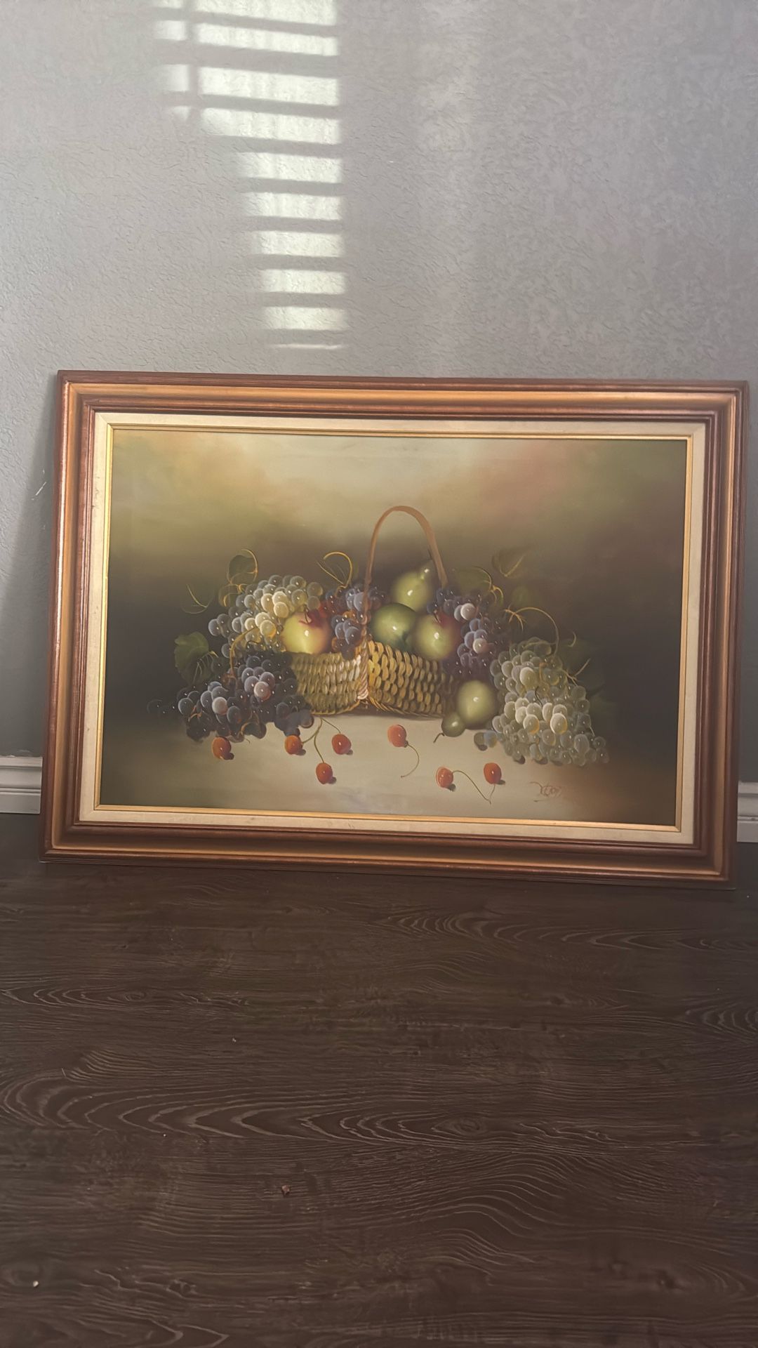 This a still life oil painting on canvas titled Still Life with Fruit and Wine by the artist B. Burman. The painting depicts an abundance of fruit, including grapes, apples, and cherries, overflowing from a woven basket. It is an original, hand-signed, and custom-framed piece of artwork. The painting is dated to 1965. This style of painting, featuring plump and ripe fruit, is considered quintessential dining room decor.