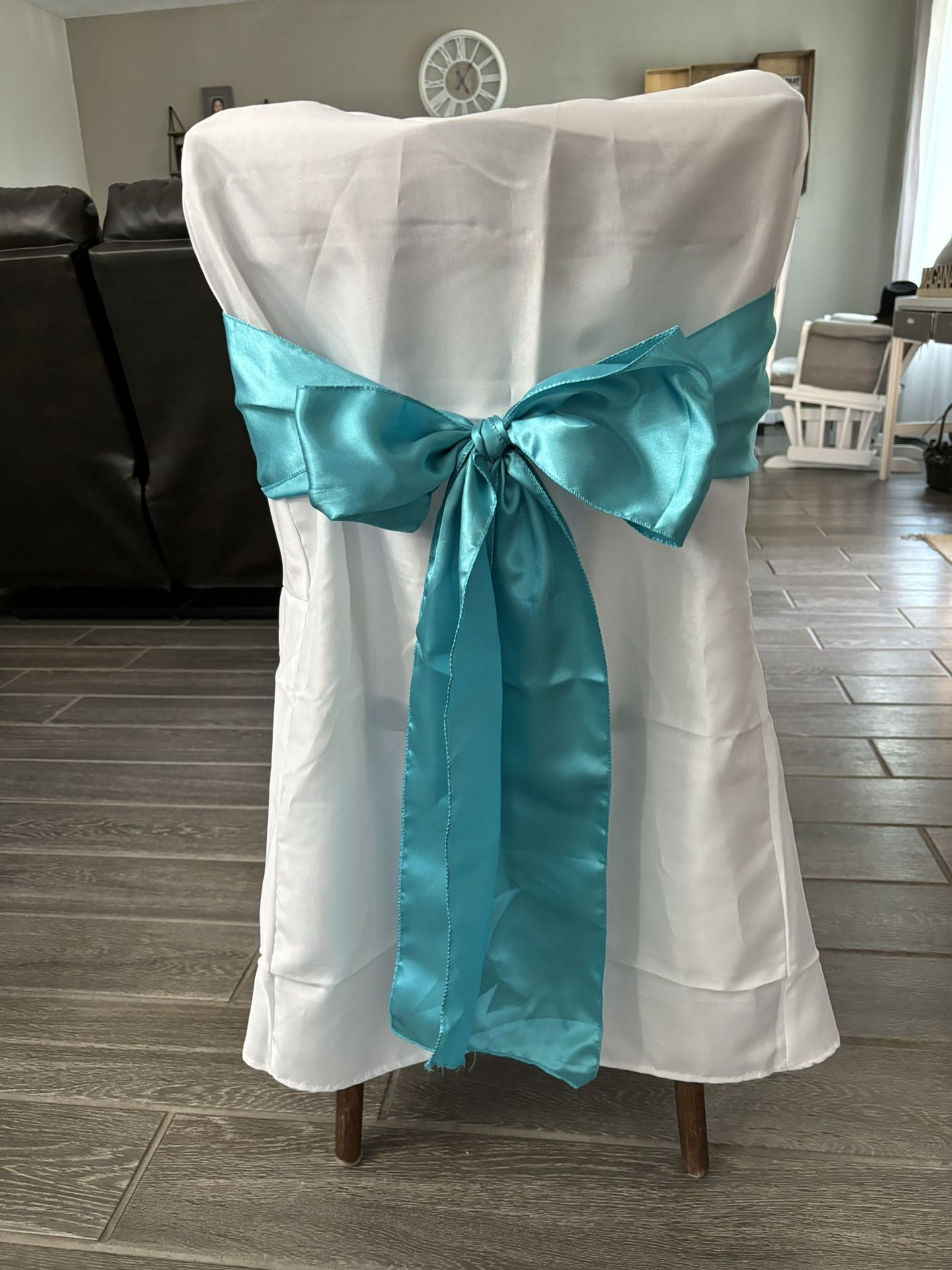 Selling party decor: 180 Banquet (white) for $150 53 Lamour Banquet (Satin white) $50 Sashes: -Black: 193 available for $100 OBO -Teal: 65 available for $40 (As is) -Turquoise Pattern: 50 available for $30 (As is) -Blue: 100 available for $70 OBO