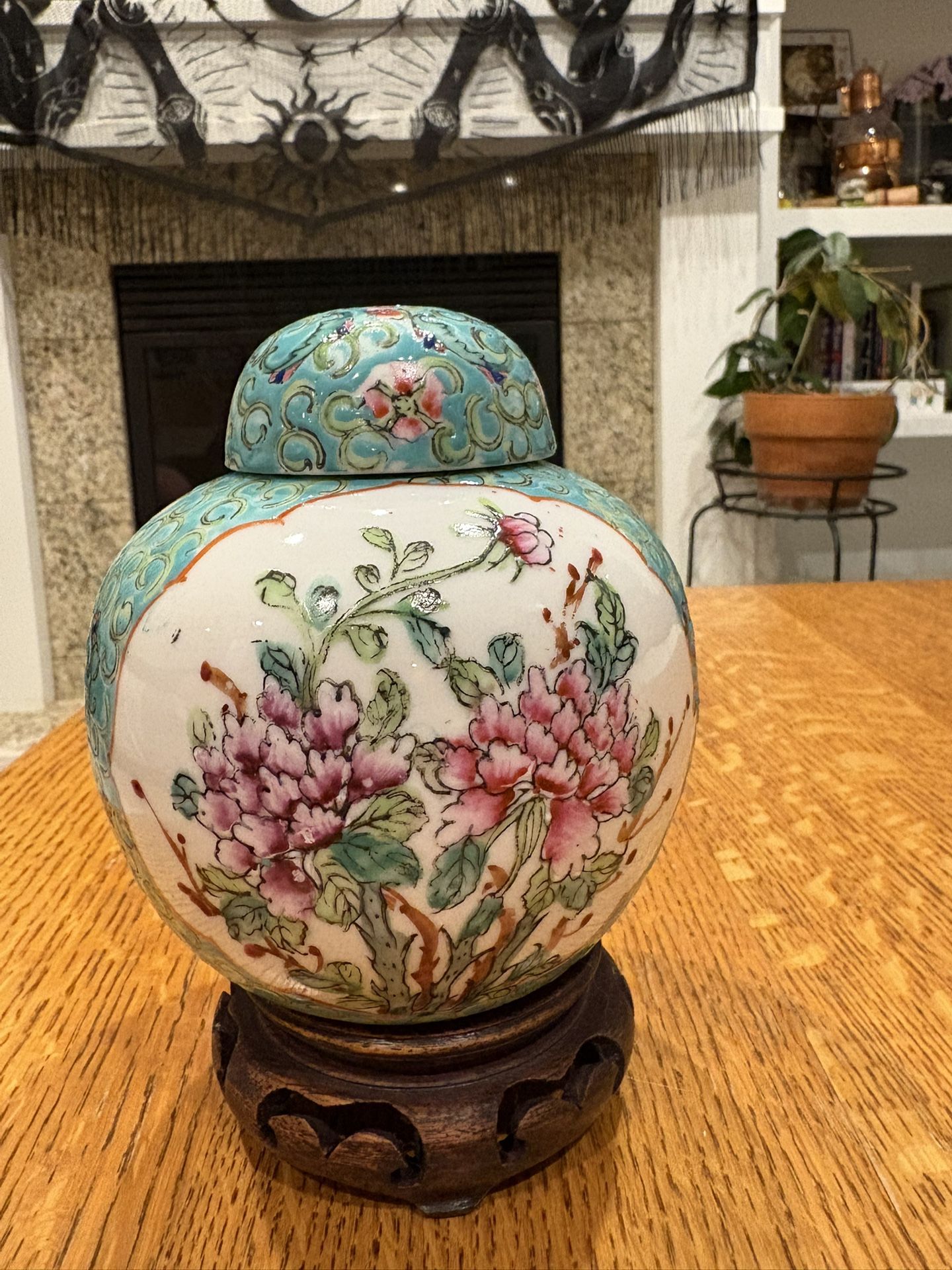 Beautiful ceramic decorative ginger jar, featuring birds and pink flowers