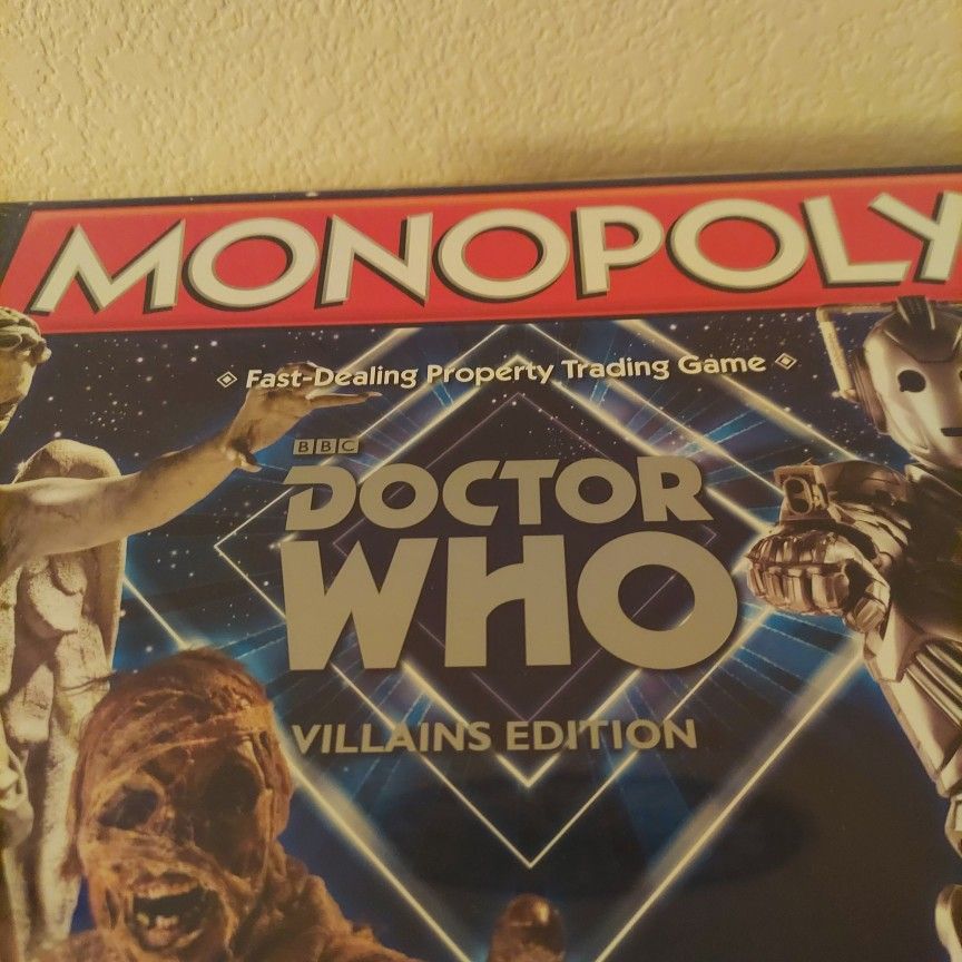 Doctor Who Monopoly: Villains Edition - NEW NEW, unopened, sealed. Tokens included: K-9, Gas mask, 12th Doctor's ring, Pandorica, River Song's diary, and TARDIS. Local pick-up only in Henderson. If this posting is still up, the item should still be available.
