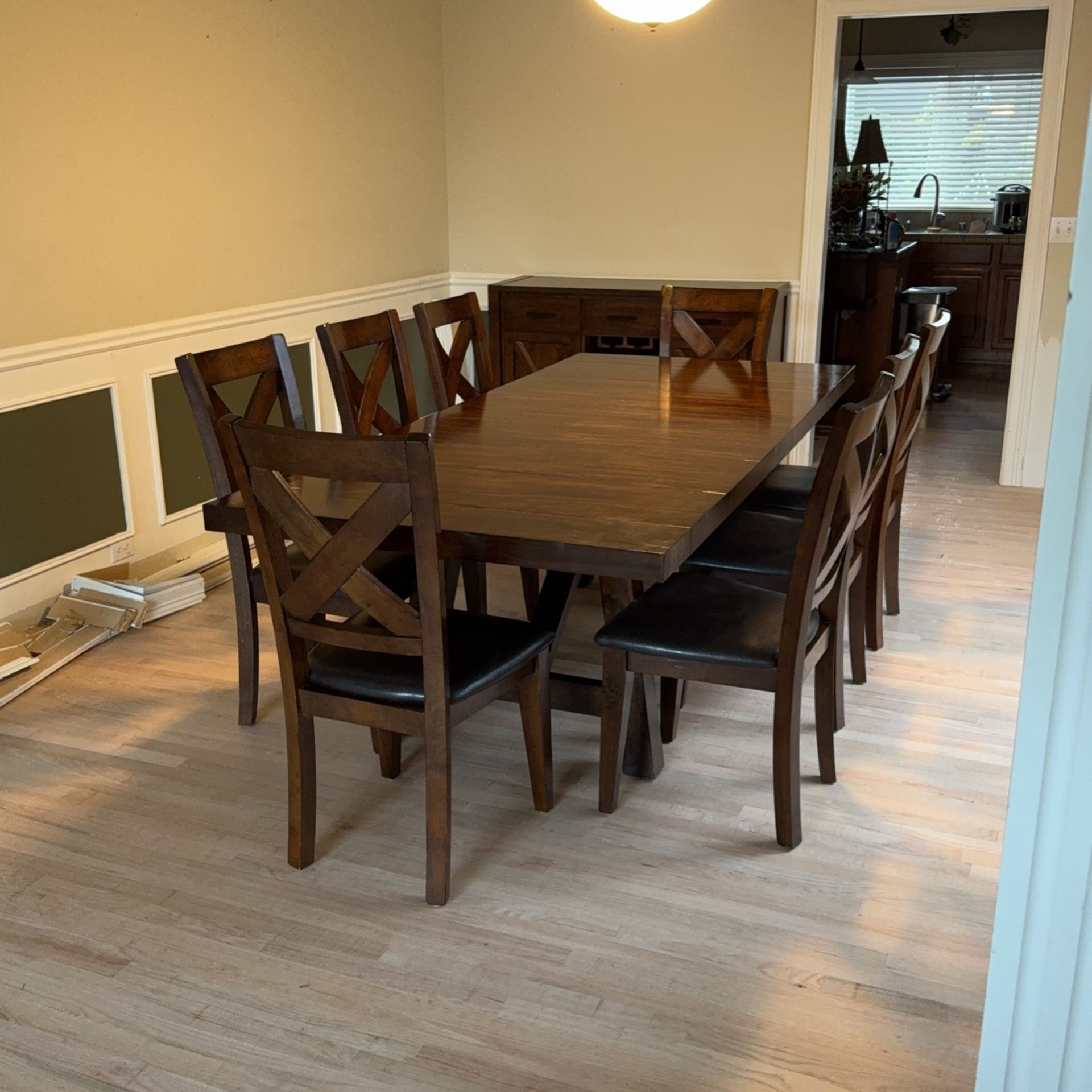 Real wood . Very heavy set . Good used condition . Table can be adjusted to 6 people .
