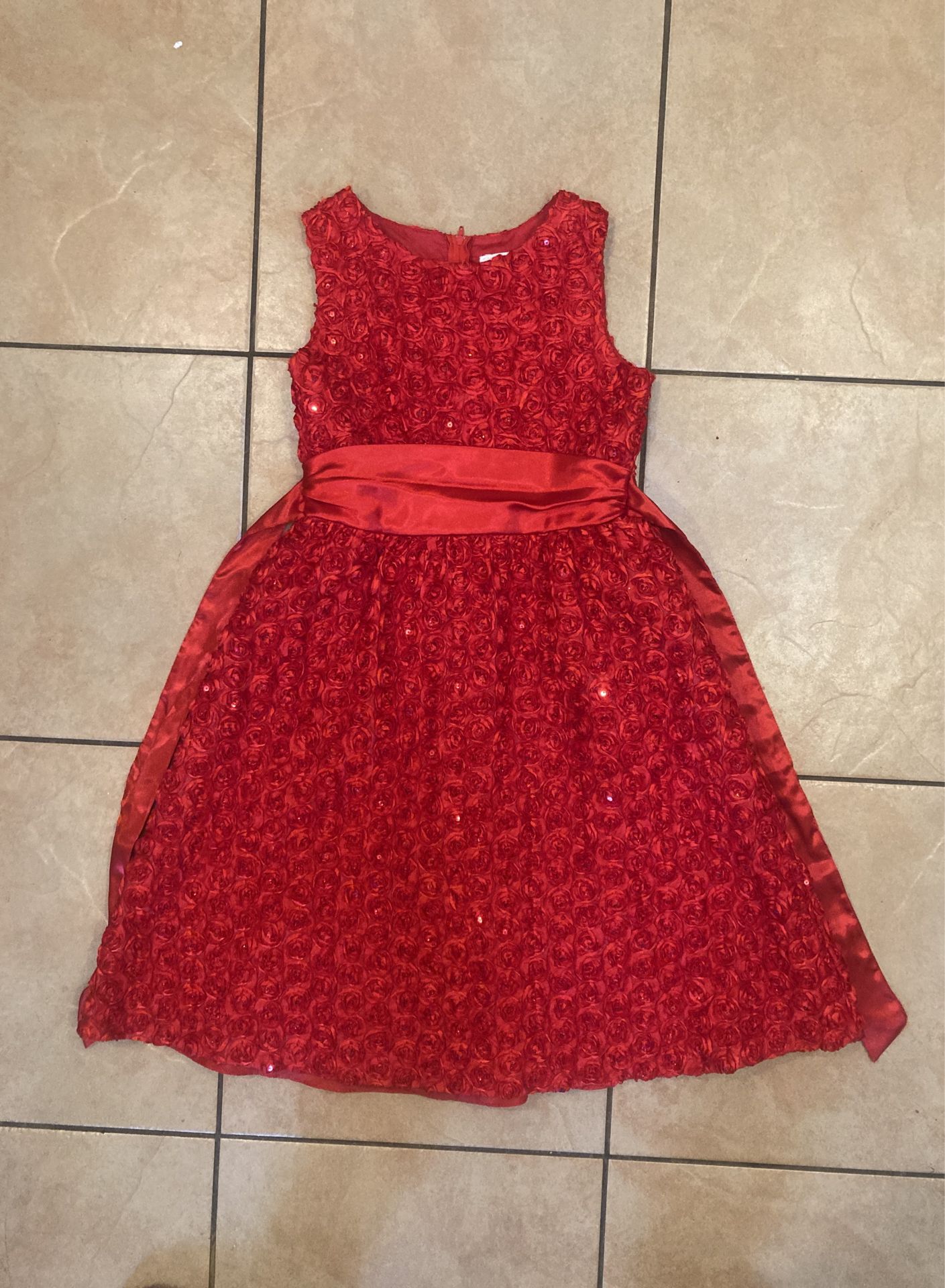 Girls Christmas dress size 14. Dress is covered in small roses with sequins. Dress has zipper and bow in the back.