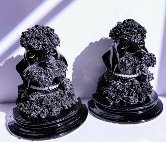 Vintage Black Spaghetti Poodle Head Bookends Coming straight to us from the 1950’s, this pair of black spaghetti poodles are extraordinary. Their expressions look quite “snobbish” with their deep set, almond shaped eyes. The spaghetti fur is over the top and really makes them . Best of all, each of these sweet poodle figurines is wearing a beautiful necklace! They measure 7 inches tall 5 3/4 inches wide and 4 1/2 inches deep. They are in excellent vintage conditions. The only issue of note is the dog with the faux pearl necklace has been repaired from a break under the neck that goes behind the ear. Believe it could be repaired better than has been previously done if you wish.. Please see last photos.