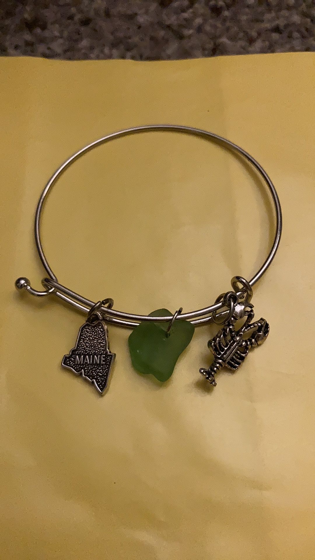 Item: Charm Bangle Bracelet- 3 Charms Charms- Light House, Sea Glass, Maine Map Color: Silver and Turquoise Brand: Handmade