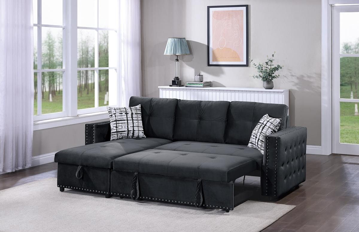 ✅️✅️2 pc black velvet sectional sofa set pull out sleep area with reversible pop up storage chaise nail head trim tufted accents✅️