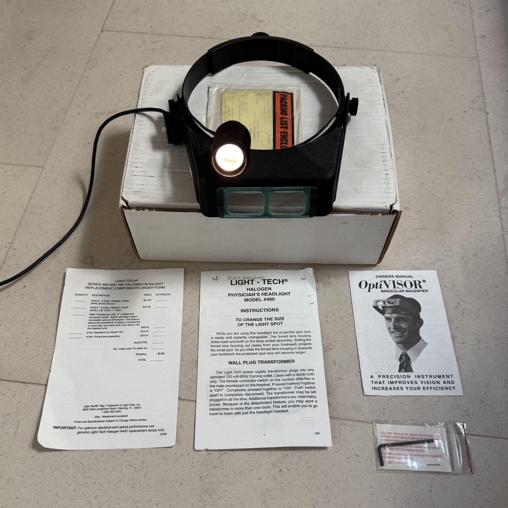 Upgrade your clinical lighting with this OptiVISOR LIGHT-TECH Model #490 halogen binocular magnifier physician's headlight. In gently used, working condition and includes owner's manual, charger and box. Great for physicians, dentists, surgeons, and other medical professionals who need hands-free bright, focused illumination for precision, improved vision and increased efficiency during procedures or exams. See photos for more detail Feel free to message me with any questions.