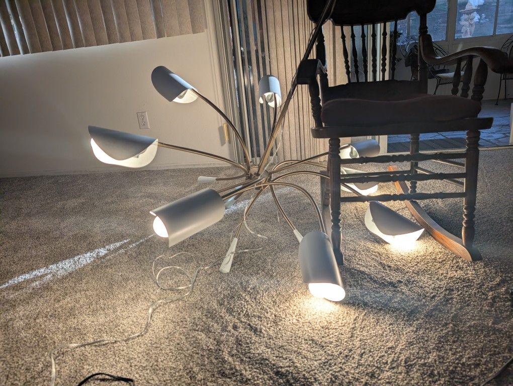 Why pay over $900 for a high-end designer fixture when you can get this one for $300? This beautiful, modern chandelier is the KICHLER Arcus 39.25 Inch 6-Light Chandelier in Champagne Bronze with White shades—a premium fixture that instantly elevates any dining room, entryway, or living space. Official New Price: This is a high-end piece that sells new for over $900 at Amazon. Our Price: Get the same stunning look for only $300. That's over 70% off! Condition: Excellent, like-new condition. Only Used for once for a concert event. Style: Features a chic Mid-Century Modern / Sputnik inspired design with flowing champagne bronze arms and striking white metal shades. Dimensions: Diameter: 39.25 inches Height: 17 inches (Overall height adjustable up to 51.25 inches) Ready for Installation: We've done the hardest part for you! All the arms and wires have already been connected. You just need to take it home and bolt it directly to your ceiling box. Don't settle for cheap hardware store lighting. Bring home this statement piece today! Ask Price: $200 OBO Pick up Orangecrest/Riverside.