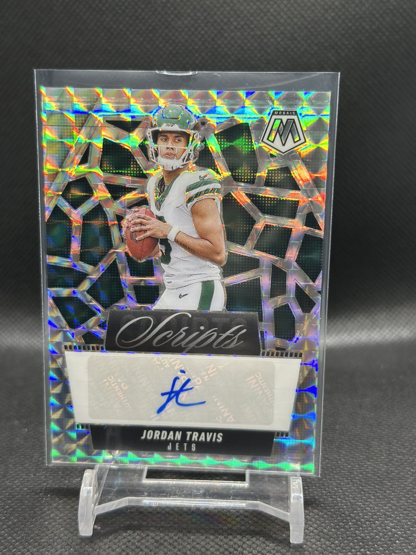 💥 Jordan Travis 2025 Panini Mosaic Scripts Mosaic Prizm Auto #SCR-JTS Jets