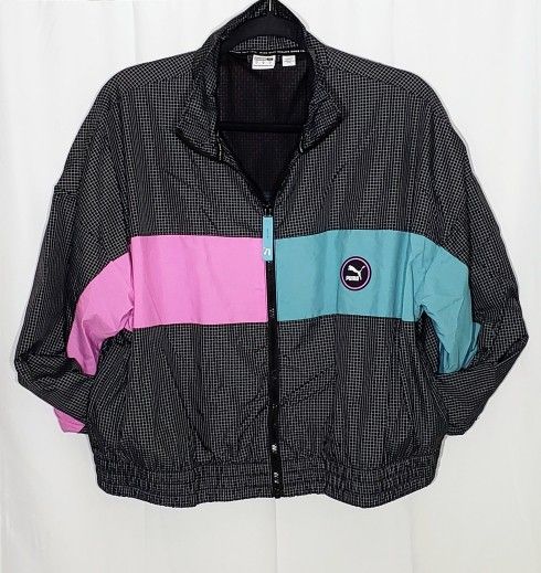 Very gently used, great condition. Fits a little "short", or you can style as a crop jacket. Great retro looks and colors. It has a water-repellent coating to keep you dry. It features side pockets with zippered, elastic cuffs, and hem, a color-block panel as a designed element, a Puma badge with 3D embroidery on the chest, and a Puma formstrip insert on the back panel. Please view all photos.