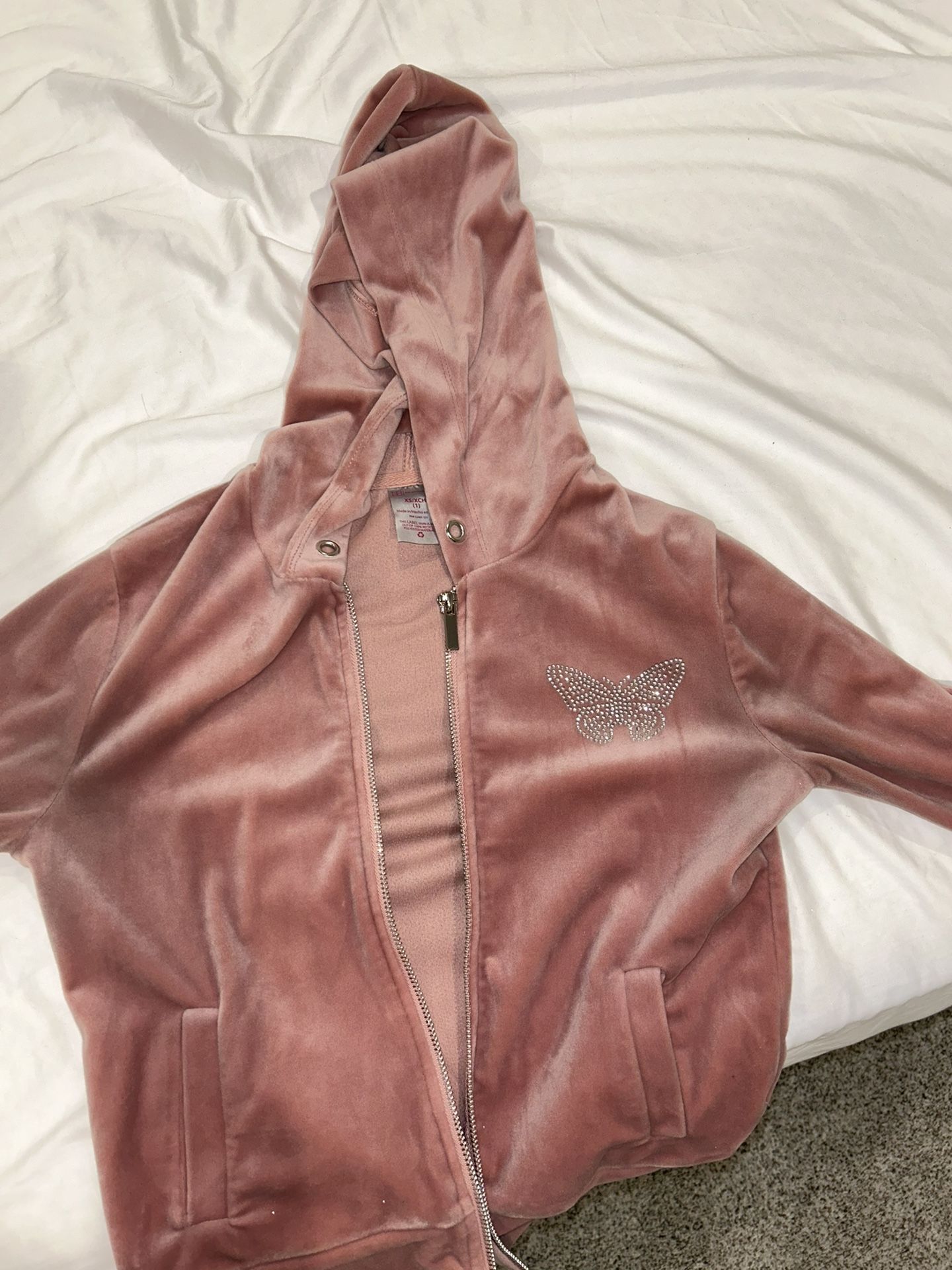 Pink, velvety, has a butterfly of rhinesyones on the side. Size XS but fits S too
