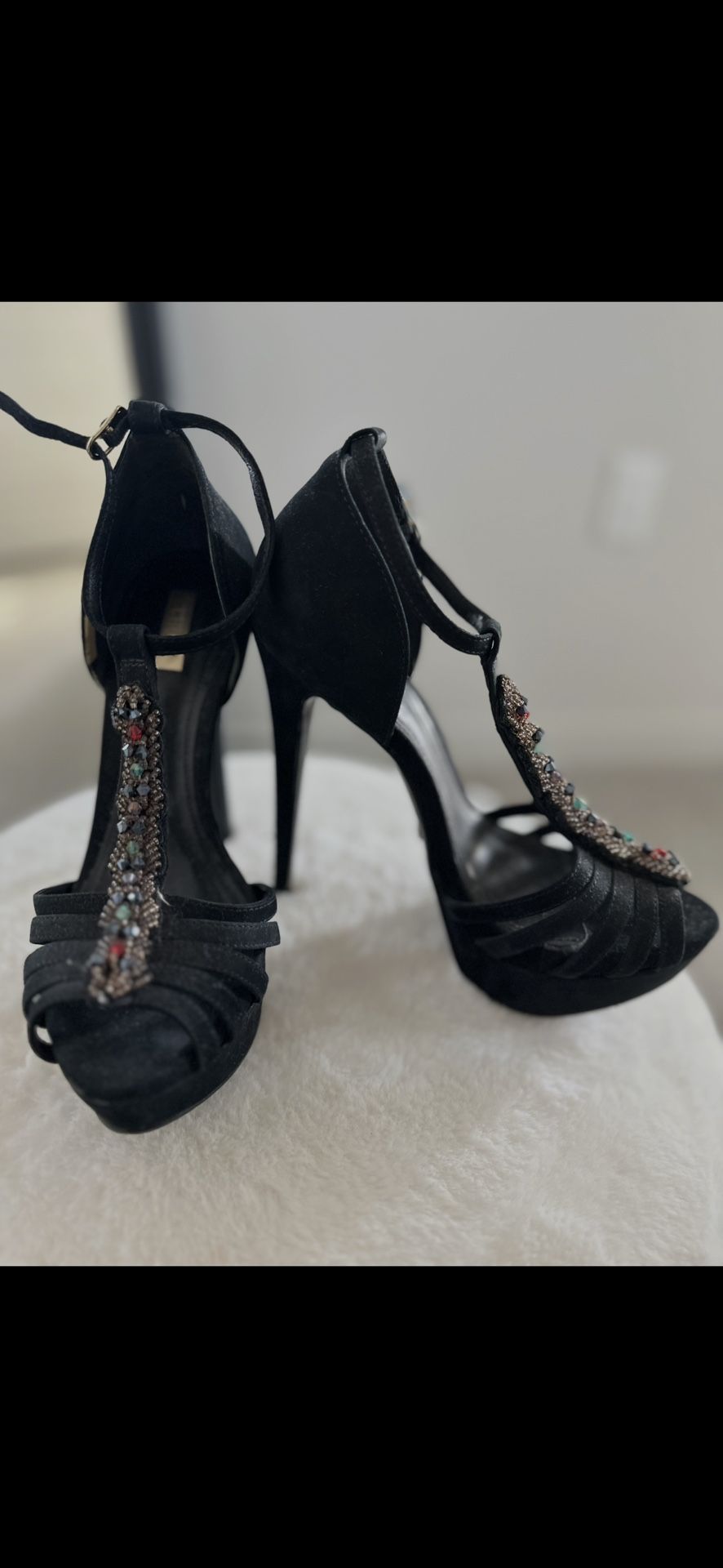 Chic black Shutz stiletto heels with a stunning beaded design along the front strap — ideal for evening wear, parties, or formal events. ✔️ Beautiful jeweled embellishment with multicolor stones ✔️ Soft suede-like material ✔️ Platform base for added comfort and stability ✔️ Size: 6.5
