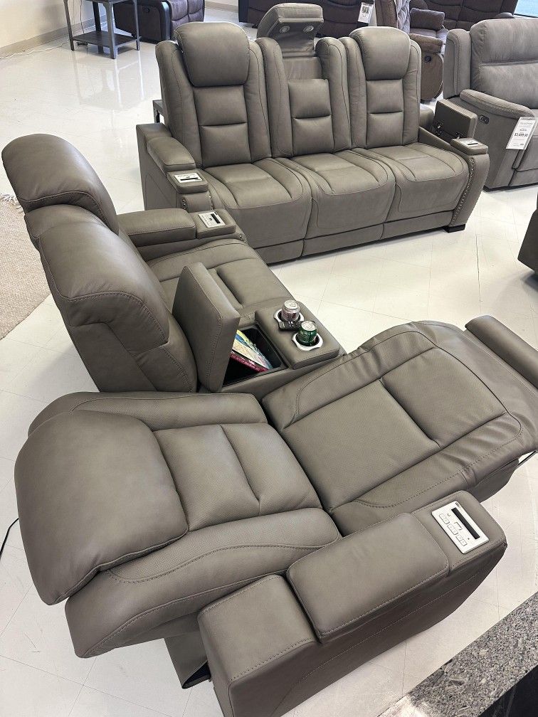 Man Den Gray Real Leather Power Reclining 2 Piece Sofa and Loveseat Set /P