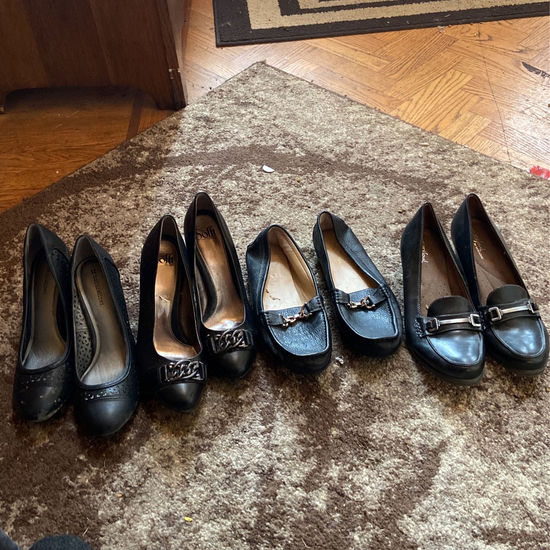 4 pairs of black shoes. All similar to naturalizer. Softy, naturalizer, mark fisher and natural soul. Size 10. All 4 pairs 25 dollars or 10 dollars a pair.