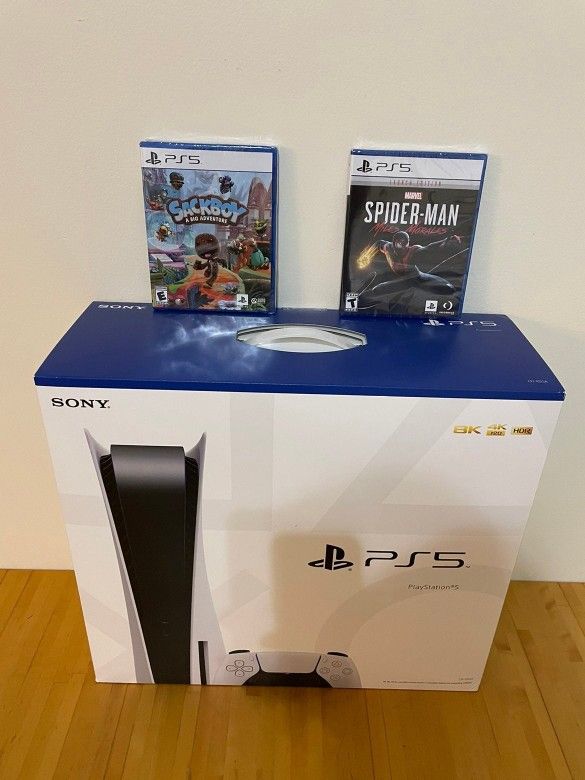 Brand New Never Opened PS5 Disc Console comes with Sackboy A Big Adventure and Spider-Man Miles Morales Launch Edition.