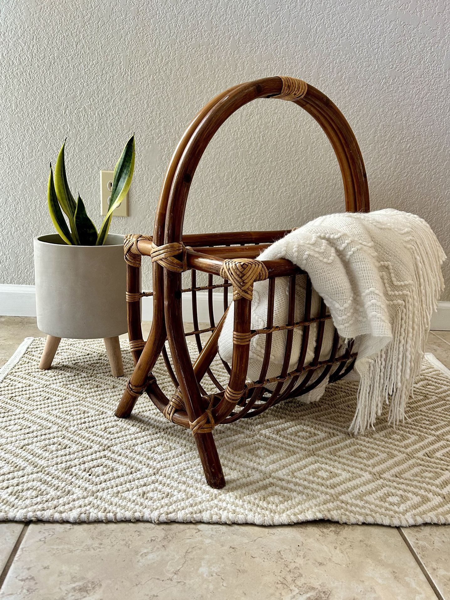 Vintage Rattan Bamboo Magazine Rack Boho Farmhouse Home Decor Neutral Natural