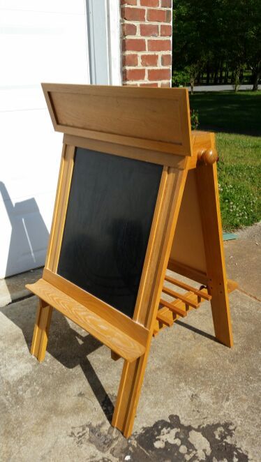 Solid oak childs easel with dry erase whiteboard on one side, blackboard on the other. Storage compartment for chalk, paint and markers in the top. Cash only. Firm.