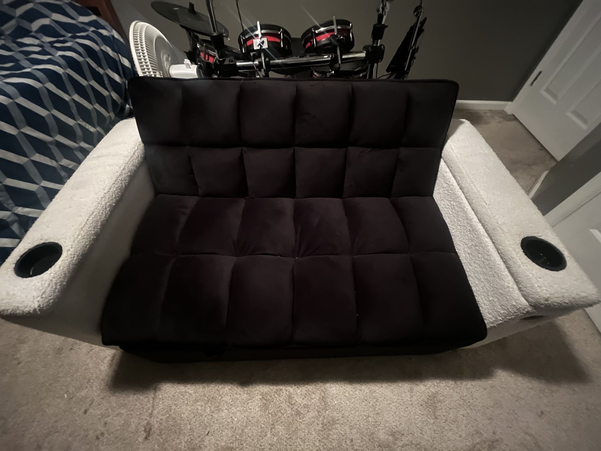 Sofa extends to become a bed, each arm has hidden compartments aswell as side pockets, cupholders, and a built in usb port. Great condition