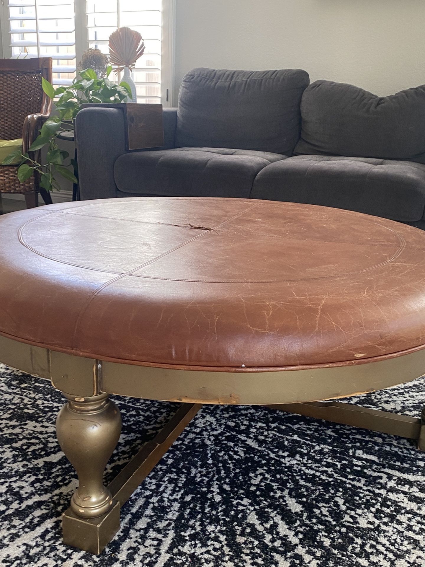 Ottoman coffee table. Worn leather on top, wood painted brass distressed on the bottom. 44 inches long, 13 inches high. Small unravel on top in seam, see photo.