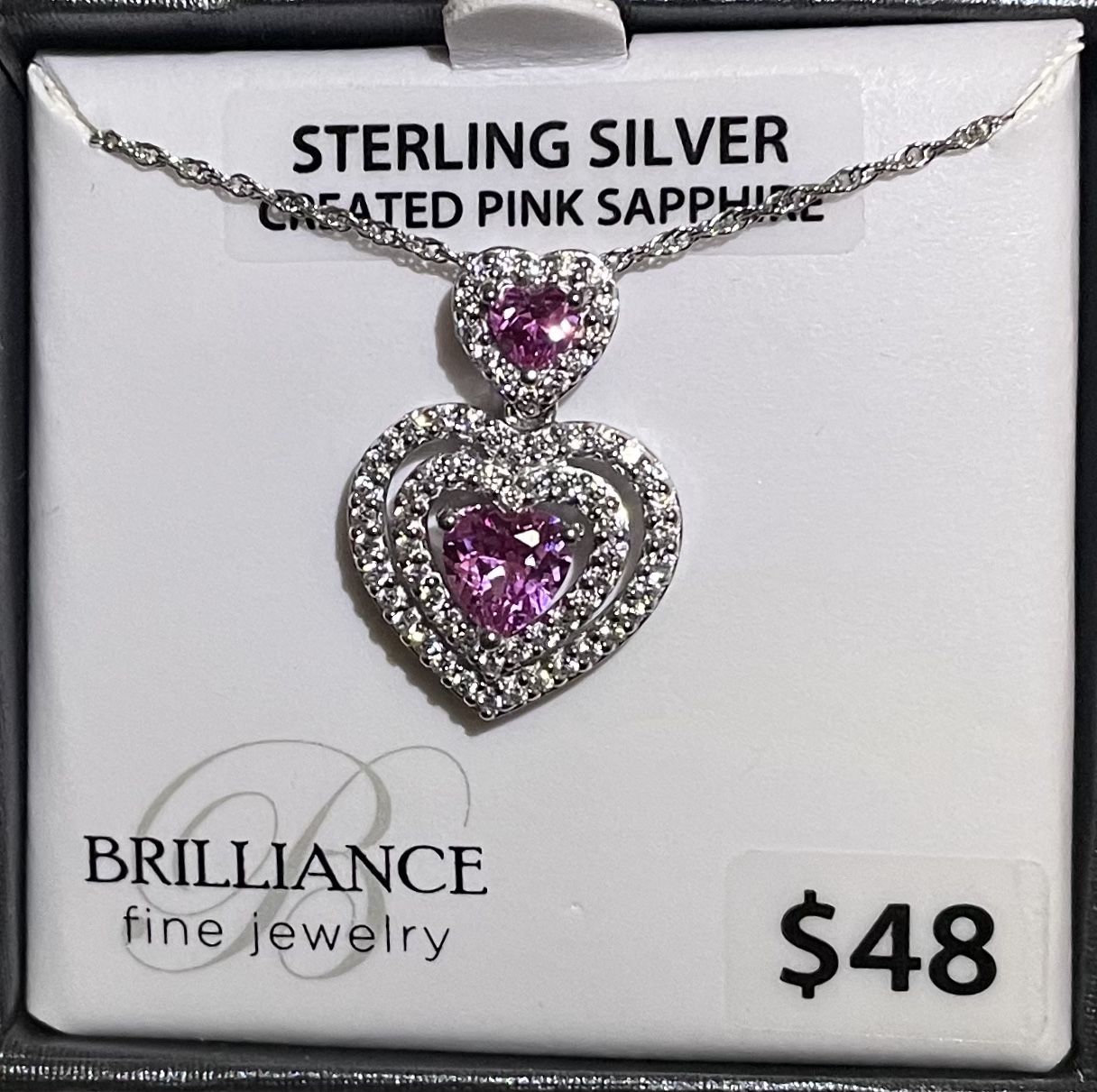 Brilliance Fine Jewelry Sterling Silver Created Pink Sapphire and White CZ Double Heart Pendant, 18"