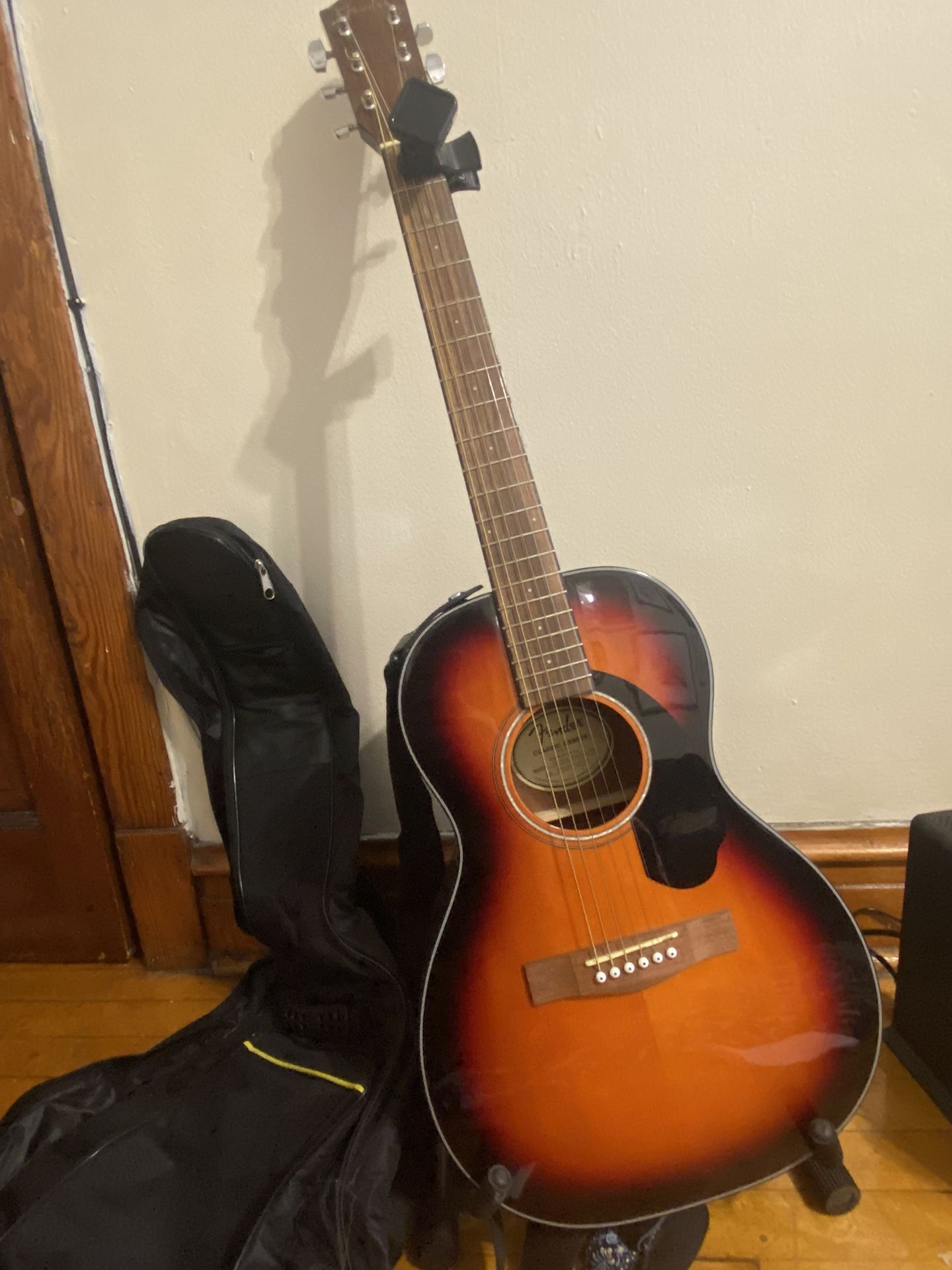 This is a fantastic beginner guitar built to last! It’s a Fender CP-60S bought from Guitar Center about 3 years ago and barely used. Kit includes soft case, electric tuner, picks, unused light gauge strings, strap and stand. It has been restrung with light gauge strings, making it ideal for a beginner or someone on the smaller side. For reference, this is the type of guitar Ed Sheeran uses!
