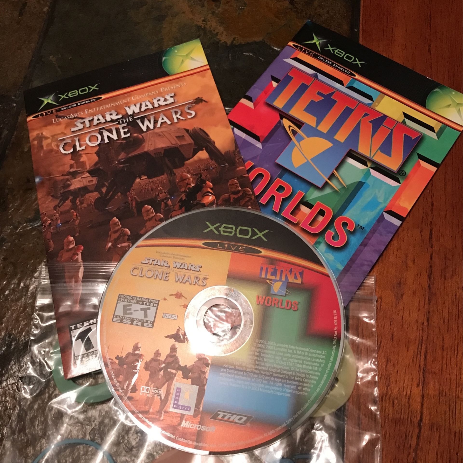 Used Xbox game Star Wars the clone wars and Tetris worlds combo in one game. Rated teen and everyone. Comes with case pamphlet but no case. Serious buyers only. Cash and pick up please
