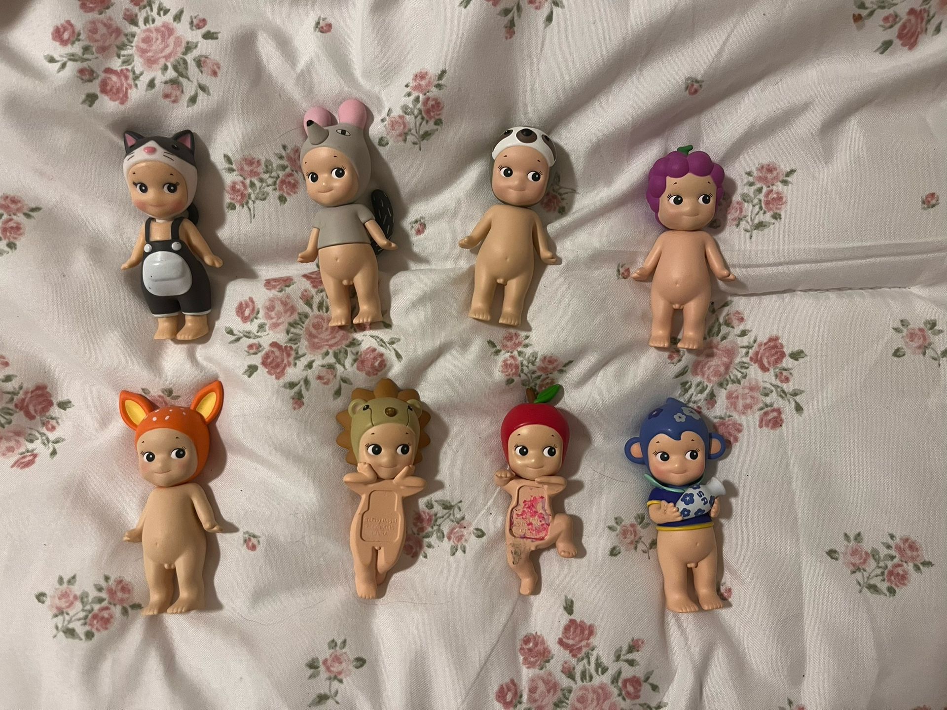 6 regular sonny angels and 2 hippers! The hippers don’t have anymore stickiness to them and have tiny scuffs on the backs of their heads from general wear and tear, but nothing too bad. $7 individually or $45 for the entire bundle!