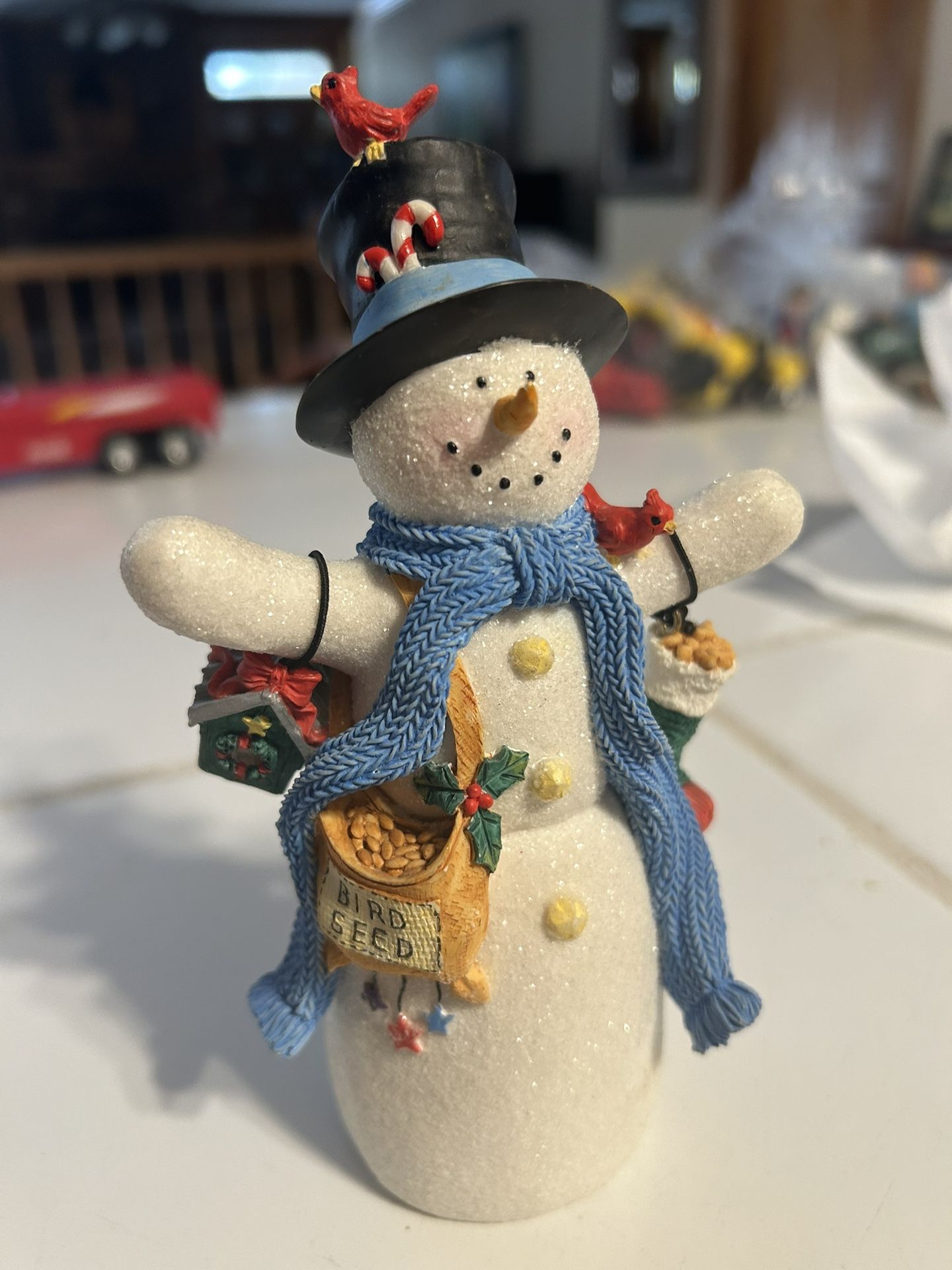 Hallmark 2003 Multicolor Snowman figurine featuring a birdseed bag. It is made of mixed materials with a frosted glitter finish. The snowman wears a blue scarf, a black top hat, and holds a stocking and a bag labeled "birdseed". Two red cardinal birds are featured on the figurine, one on the hat and one on the left arm. It is an American-style collectible item suitable for Christmas seasonal decor.