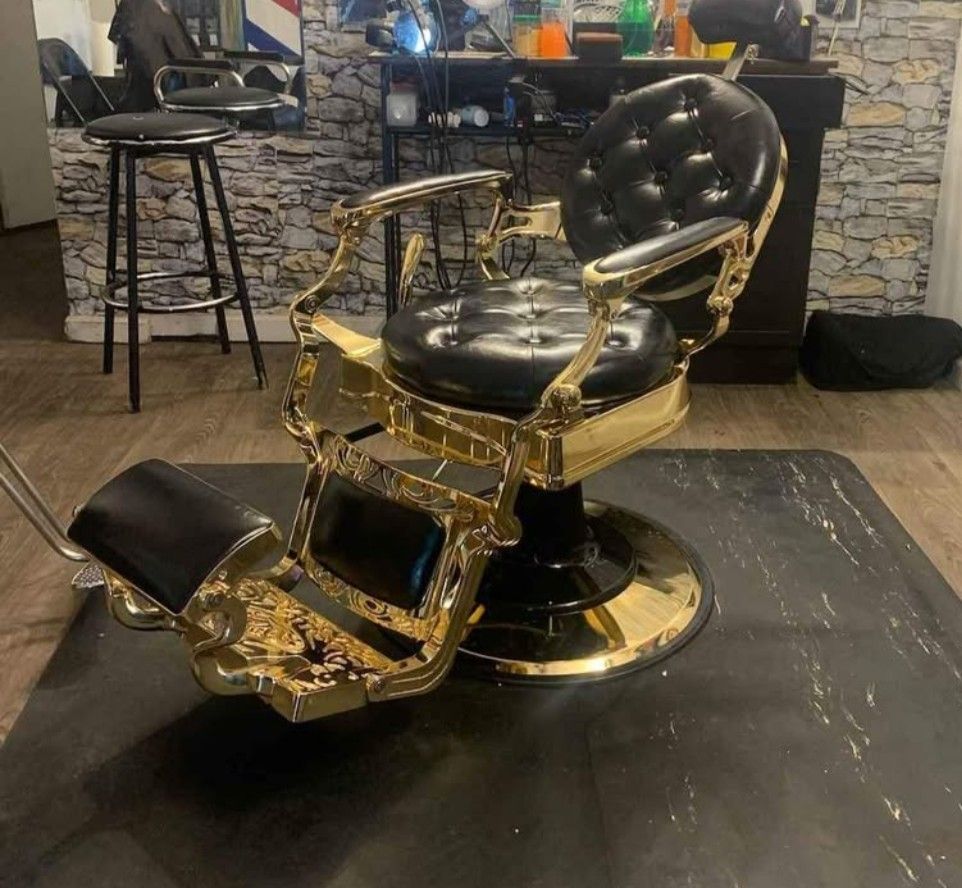 Black and gold barber chair, brand new in the box. Open to reasonable offers. Please send me a message with your best offer!