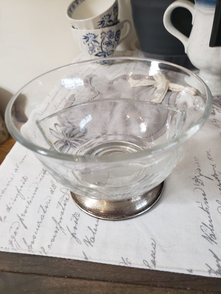 Vintage Clear Glass Divided Floral Etched Bowl with Sterling Base