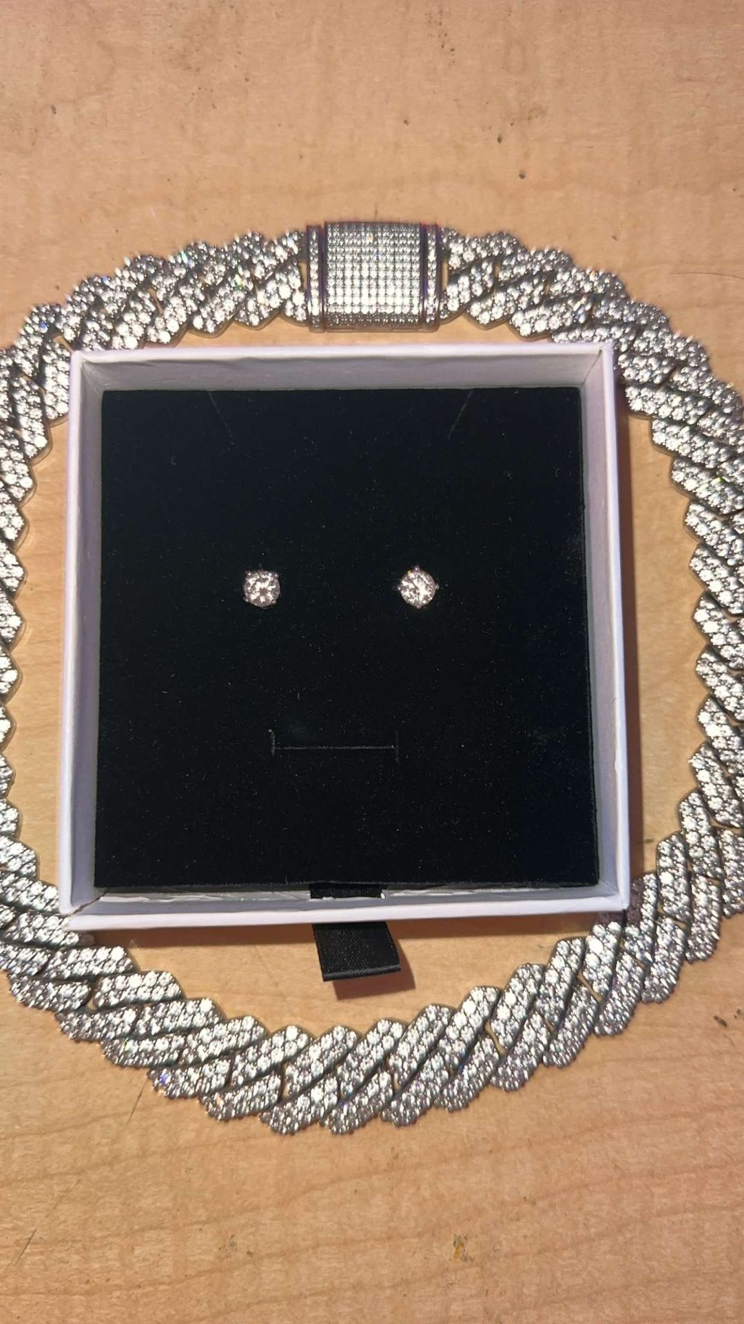 Both are for sale for $300 Chain alone is $150 Earrings for $100 Chain is 19MM White Gold Plated with Lab Simulants Earrings are D Color VVS Moissanite Brand New Send offers
