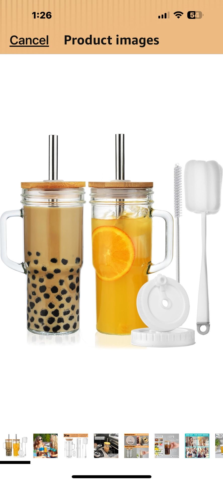 Glass Cups with Bamboo Lids and Straws, 24oz iced Coffee Cups Tumbler with Handle, 2 Pack Mason Jar with Lid and Straw, Drinking Glass Boba Smoothie Cups, 2 Brushes