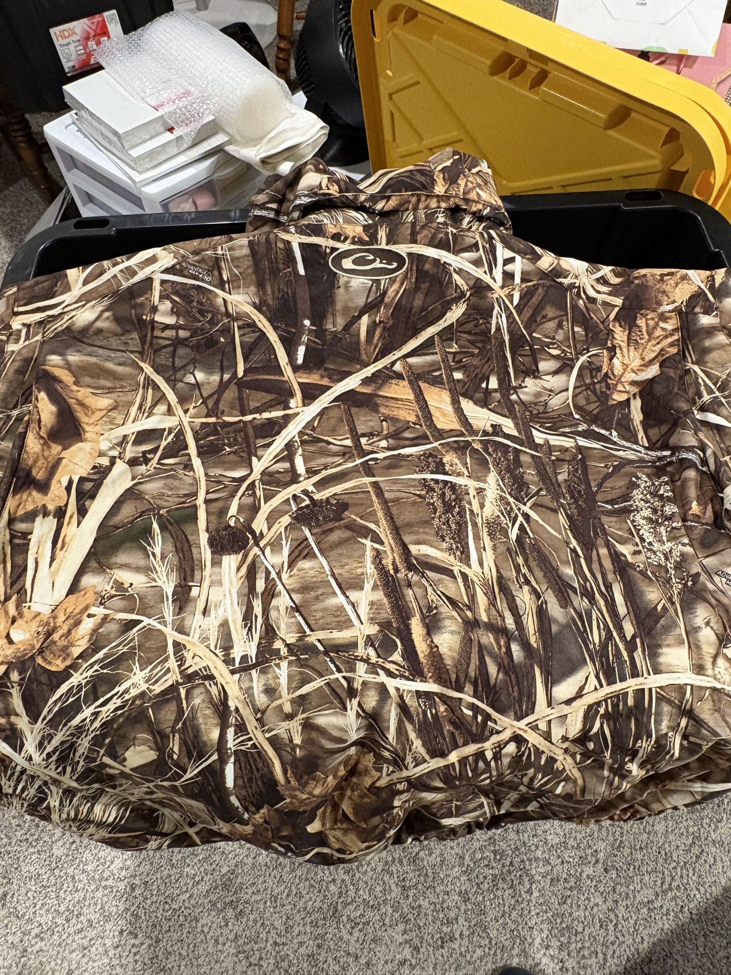 Drake Waterfowl Systems camo hunting jacket in size 2XL. This is a 3‑in‑1 jacket with a zip‑out insulated liner that can be worn on its own, or zipped in for cold weather. Really warm and well made — great for duck season, late‑season hunts, or just being outside in cold weather. Has lots of pockets, including a zippered outer shell blocks wind and cold well. Camo pattern is Mossy Oak Shadow Grass, no rips, broken zippers, and clean.
