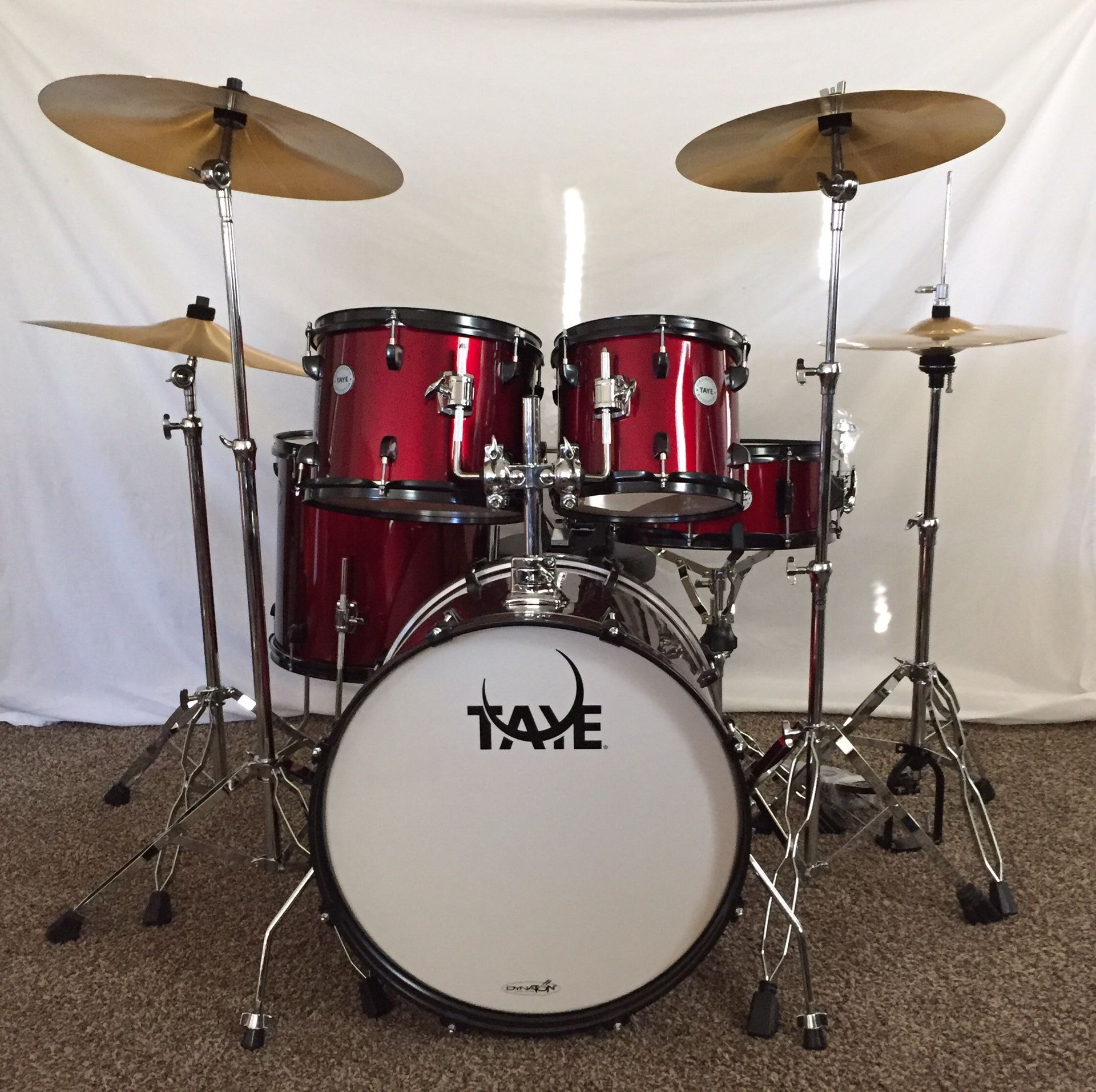 Brand new Taye Drums Galactic Audition 5 piece drum set in wine red finish with double braced hardware. This is a great intermediate level kit and features 100% poplar shells which produce a full rounded tone and are easy to tune, durable laminate wrap finish with black lugs and hoops and includes double braced hardware “cymbals not included.” Sizes: 20x16 bass drum 10x8.5 and 12x9 rack toms 14x14 floor tom 14x5.5 snare drum Hardware: 3 - Double braced straight cymbal stands 1 - Double braced hi-hat stand 1 - Double braced snare drum stand 1 - Single bass drum pedal 1 - Drum throne Selling for just $375.00. Thank you and please let me know if you have any question.