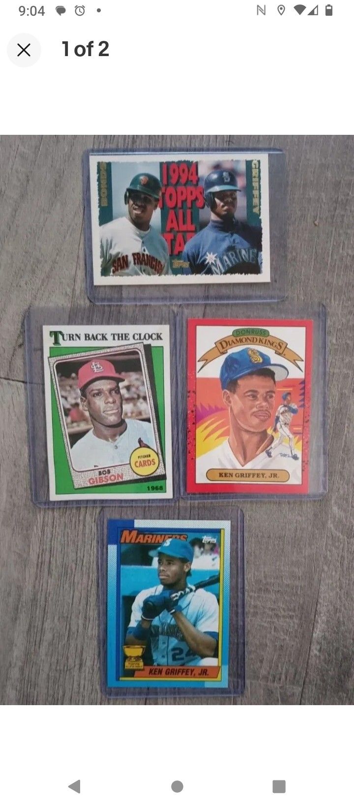 Cards Included: 1. DONRUSS DIAMONDKINGS KEN GRIFFEY JR (1989) 2. 1994 TOPPS ALL STAR BONDS/GRIFFEY (1995) 3. TURN BACK THE CLOCK BOB GIBSON (1988) 4. TOPPS ALLSTAR ROOKIE KEN GRIFFEY JR BLODDY SCAR (1989)