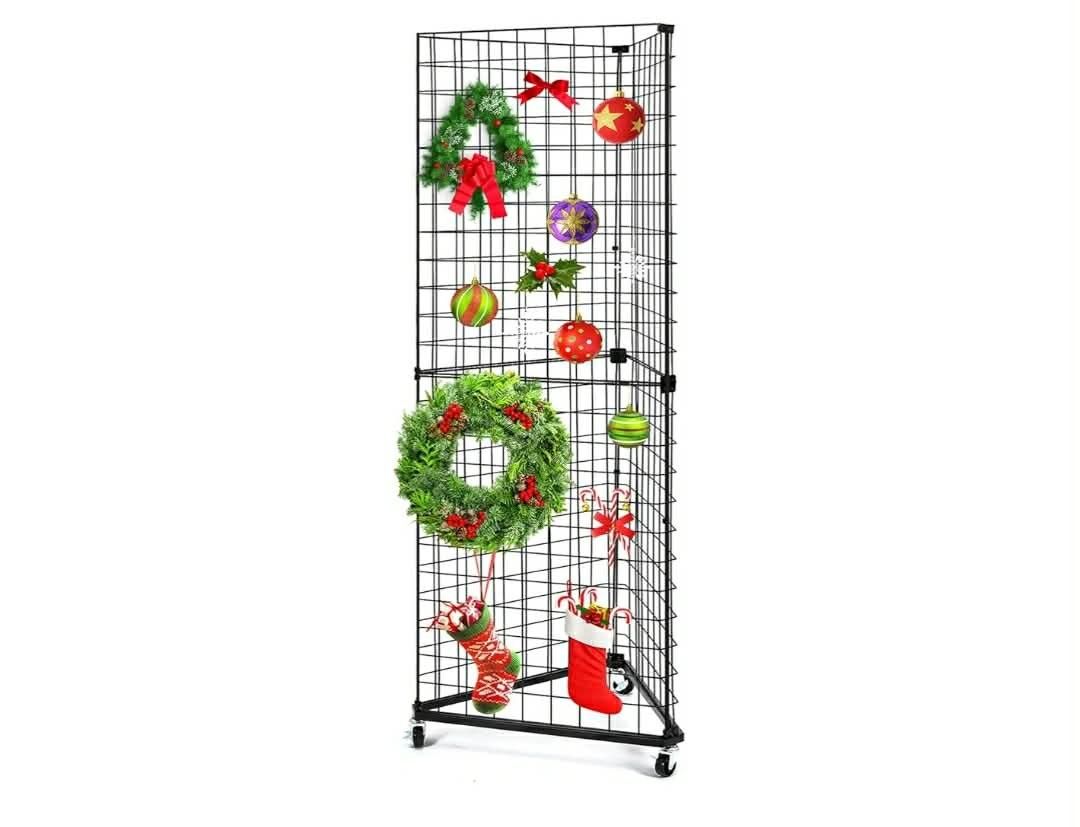 New Triangular Gridwall Panel Display Stand, Black Triangle Wire Grid Tower with Base and Casters, 24" x 68" Rolling Grid Wall, Panel Stand for Home Organization, Retail, Trade Show, Vendor Material: Metal Mounting Type: Floor Mount Room Type: Living Room Shelf Type: Gridwall Shelf Number of Shelves: 6 Special Feature: Detachable Durability- Our display rack is made of high-quality material and built to last. It features robust metal construction for strong holding, and each side can bear up to 55 LBS which provides stability and supports a variety of merchandise securely. Space Optimization- The triangle grid design efficiently maximizes storage space while offering a flexible solution for showcasing various products, making it perfect for limited floor areas. An efficient wire display rack for craft shows! Fashionable Mobile Grid Display- Equipped with a sturdy base and casters, this grid display can be effortlessly relocated within your store or event space. Its minimalist yet stylish design enhances the visual appeal of your merchandise. Versatility Usage- triangle grid wall stand design accommodates various hooks and shelves, optimizing your display space. Great for decor and DIY storage(hooks not included) and used in various settings, such as craft shows and home usage. Complete Set- Triangle Wire Grid wall with Base and Casters overall size: 24" x 20.8" x 68" and comes with 6 pieces grid wall panels, a Triangle bracket, 3 wheels and accessories. Easy assembly and it will be convenient to install when it lying, then stand up after installation. 7482