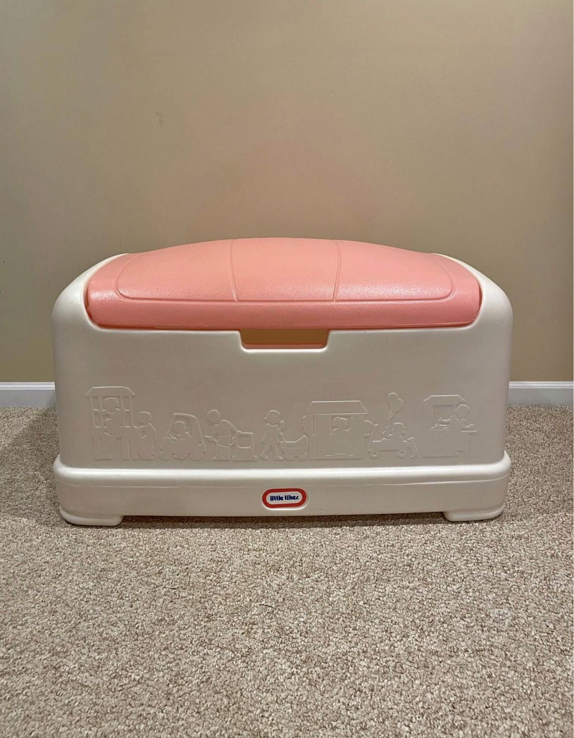 Little Tykes extra-large plastic toy chest 36.5” x 22.5” x 20.5” It has a white body with a pink lid and generous storage space. The lightweight lid is detachable and the product requires no assembly. Cleaning is also easy with just a damp cloth. Cash only - Porch pick-up