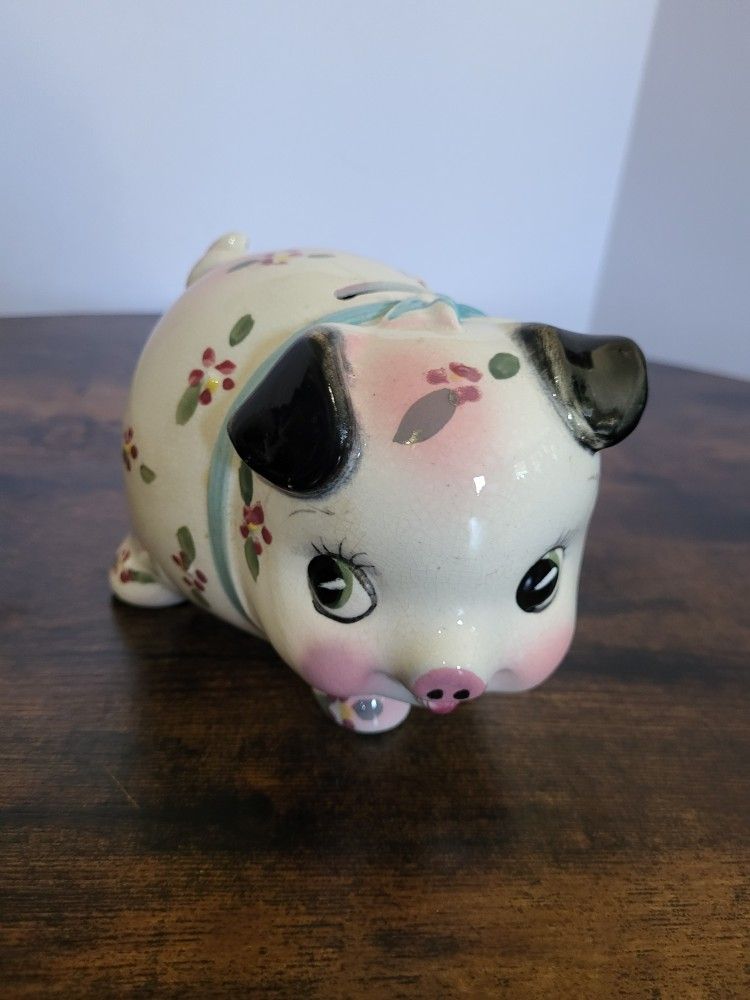 vintage Lefton pink floral piggy bank is a charming collectible item featuring a cute pig design with intricate pink and white floral detailing. Made of ceramic, this piggy bank lacks a plug, adding to its unique and nostalgic appeal. With black ears and a classic animal theme, this piece is sure to be a beloved addition to any collection of piggy banks or animal-themed decor.