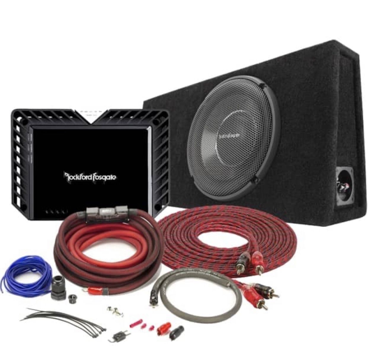 12” power subwoofer Rockford Fosgate Power Series T500-1bdCP mono sub amplifier + T1S1X12 Enclosure + M2KIT4B Wire kit + M117....
