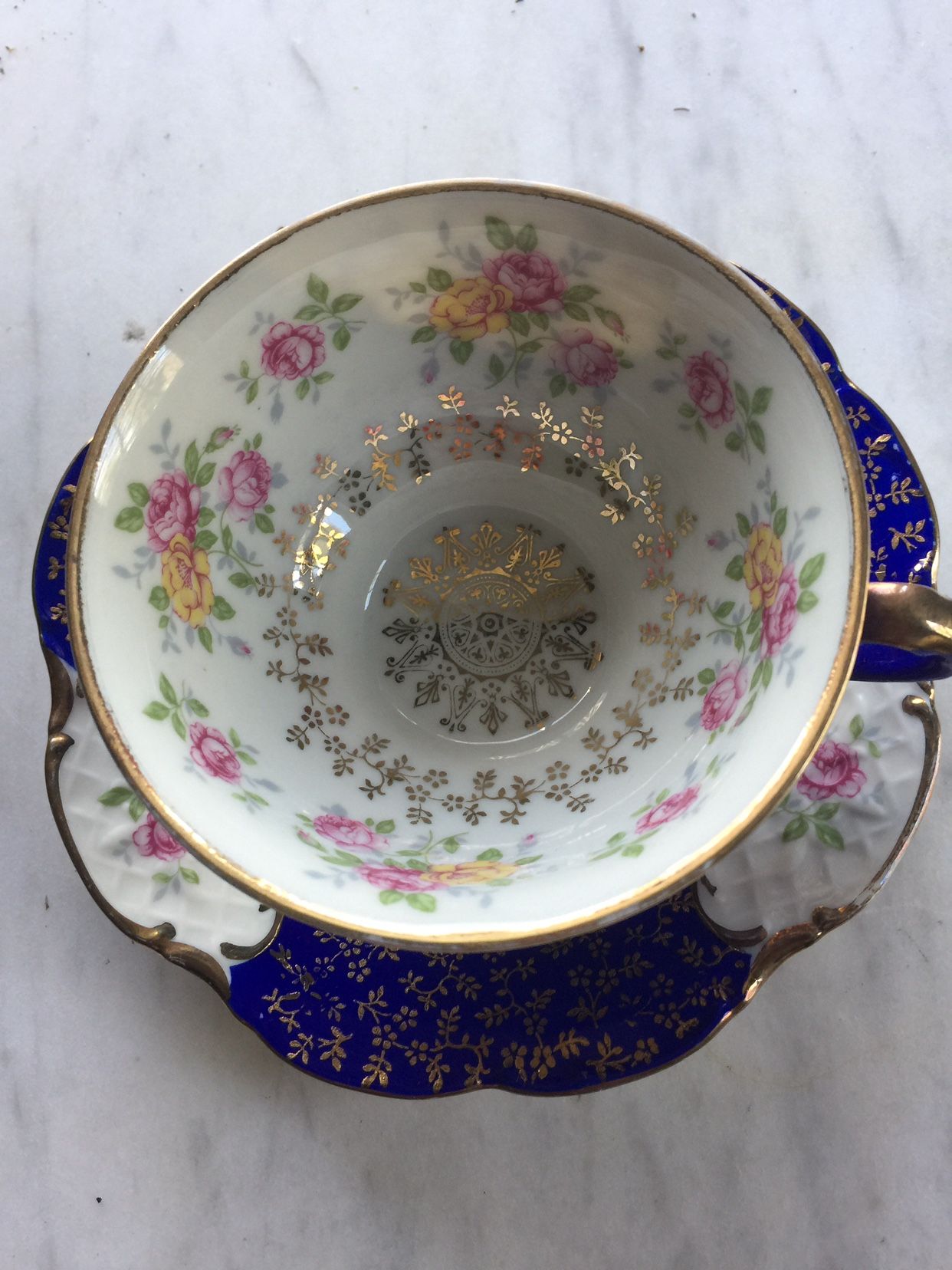 Used. No chips no cracks . Painted inside the cup. Gold discoloration on cup and saucer. Curved saucer design.