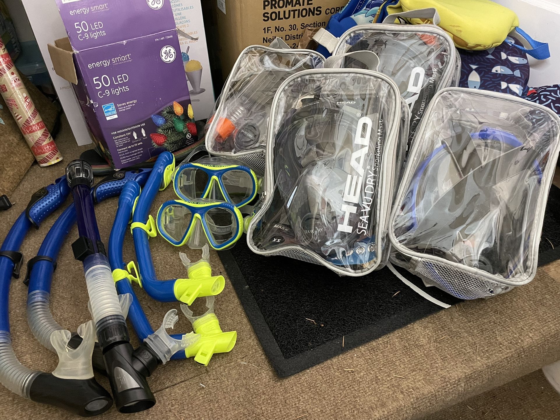 4 Head Seavu dry snorkeling mask (3 XS and 1 S) - in excellent condition - used 2-3 times. 2 kids snorkel & masks by Us Divers - like new 3 adult snorkels (bigger mouth piece and longer) - good condition Also have 2 infant life vests and 1 puddle jumper swim wings for 30-50# kiddo. Bundle: Take all for $100 Individually: Full face masks $20 Traditional mask/snorkel $12 Adult snorkel $5 Willing to ship but it depends on what you want.
