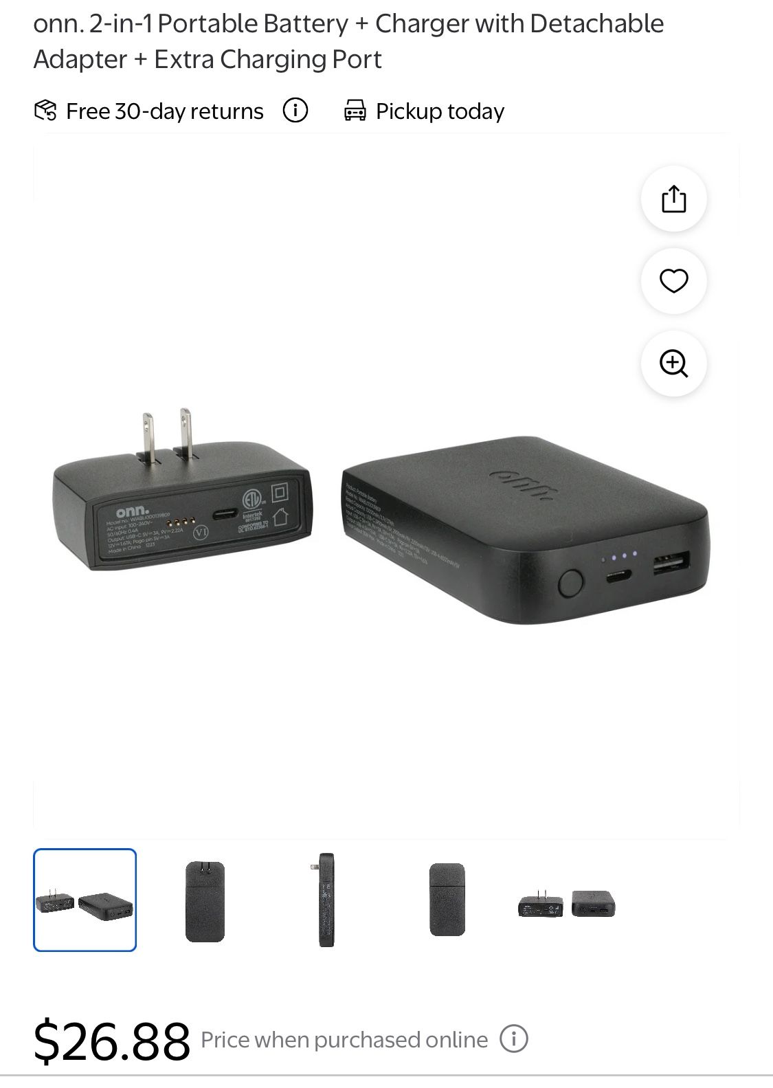 onn. 2-in-1 Portable Battery + Charger with Detachable Adapter + Extra Charging Port