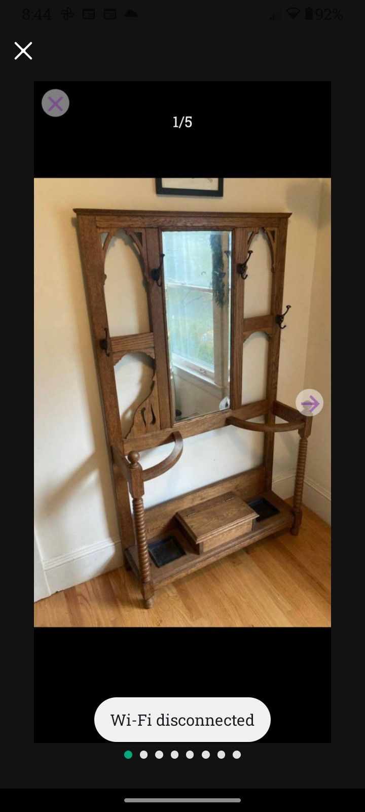 Storage box for keys, beveled edge mirror, 1920 era coat hooks, umbrella stand, church like arched trim, 72 inches tall 12 inches deep and 39 wide, Ready for cash only pickup on the north side of Queen Anne Hill Seattle, handy for rainy fall days,