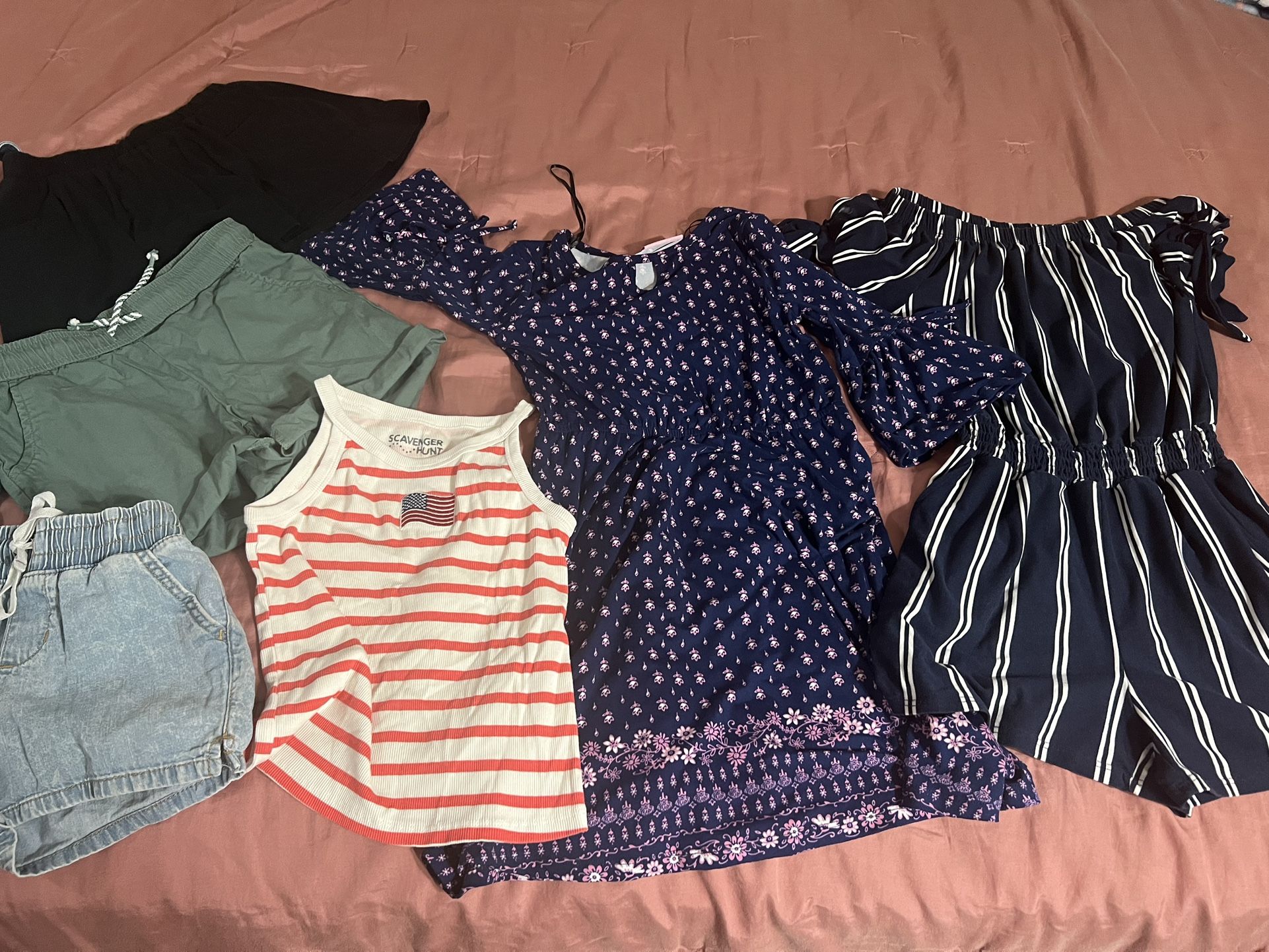 Versatile bundle of girls summer clothes. Has denim overall shorts, light wash denim shorts, olive green shorts, and black skirt. Also a red and white striped tank top with a flag, a navy floral dress, and a navy striped romper. All good for warm weather Everything for $25 (7 pieces )