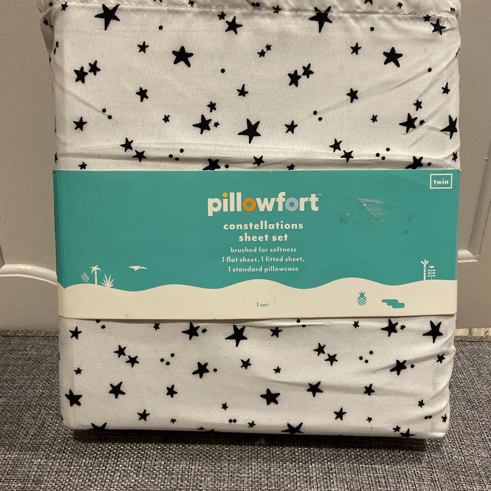 Brand New In Package!! Twin size Constellations (stars) print sheet set. Includes 1 flat sheet, 1 fitted sheet, 1 standard pillowcase. Star print is dark, dark blue. Pickup by Poway Target.