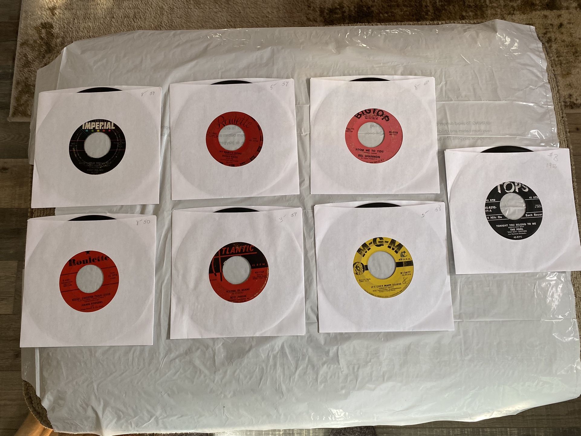 $5.00 I’m selling 7 45’s from the 50’s at $5.00 each and they are in good to very good condition. Shipping will be media mail and $4.65 for up to 3 records and $5.85 for the 7 of them. I accept PayPal for payment and ship out as soon as funds are received.