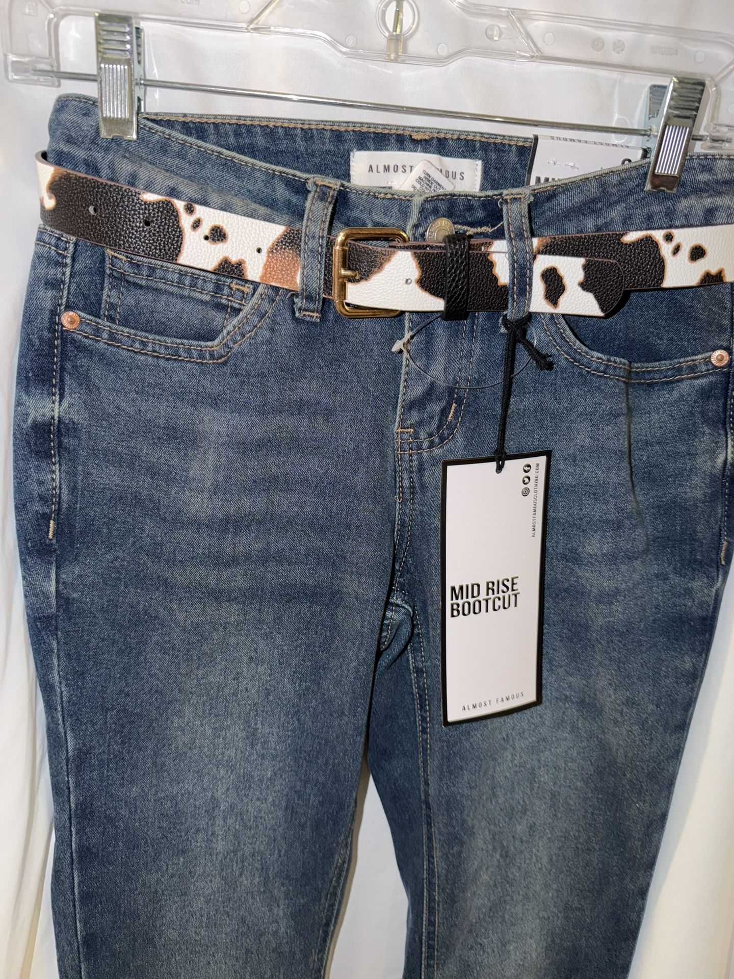 Brand new with tag, Almost Famous denim jeans, juniors size 0, has cute cow print belt with gold buckle. Mid rise, bootcut, stretchy and cute.